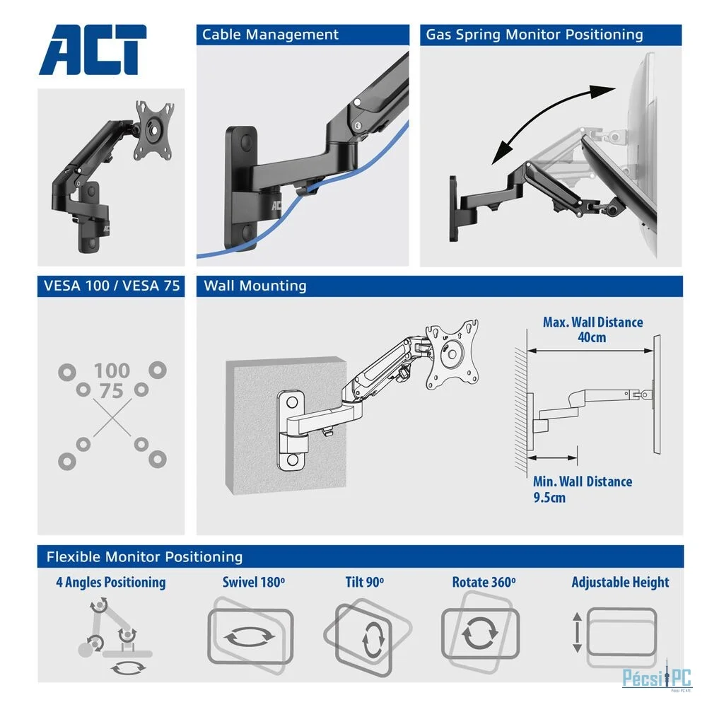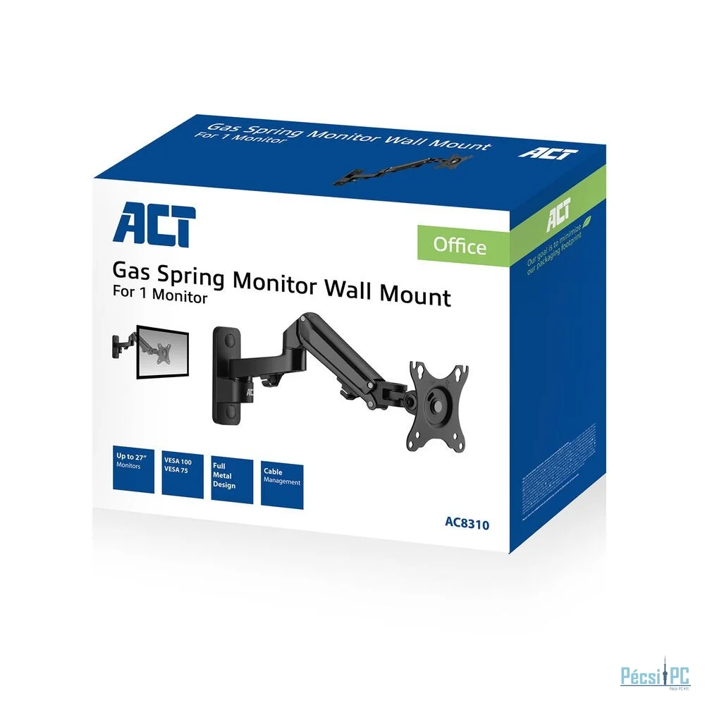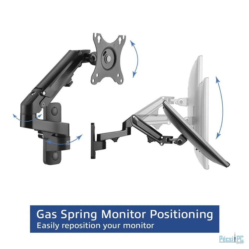Az AC8310 gázrugós monitorfali tartó ergonomikus és helytakarékos munkakörnyezetet teremt. A monitortartót egyszerűen rögzítheti a falhoz, és az AC8310-re akár 27"-es képernyőt is könnyedén felszerelhet az egyszerű képernyőfelerősítő rendszer segítségével. A képernyő látómagassága a kényelmes gázrugó segítségével szerszámok nélkül, egyszerűen állítható. Módosítsa a monitort a rugalmas képernyőbeállításokkal: döntse, forgassa és forgassa a képernyőt. A kábelkezelő rendszer a rendezett és tiszta íróasztal érdekében a kábeleket a szem elől elrejti.