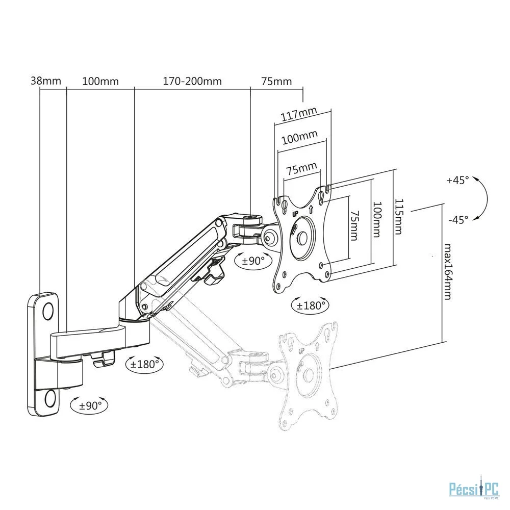 Teljes fém fali tartó 1 monitorhoz 27"-ig és 2-7 kg-ig, VESA 75x75 és 100x100 méretben