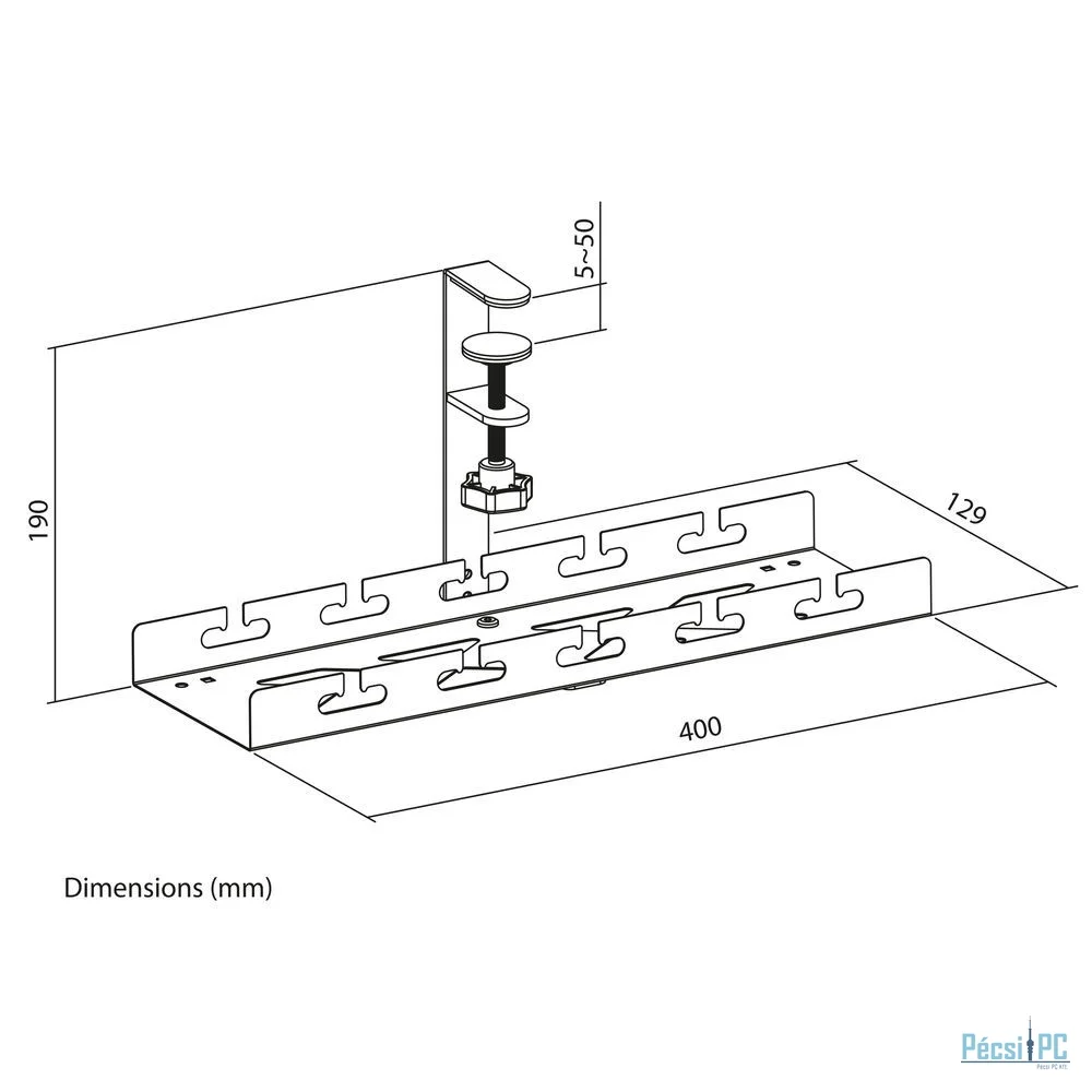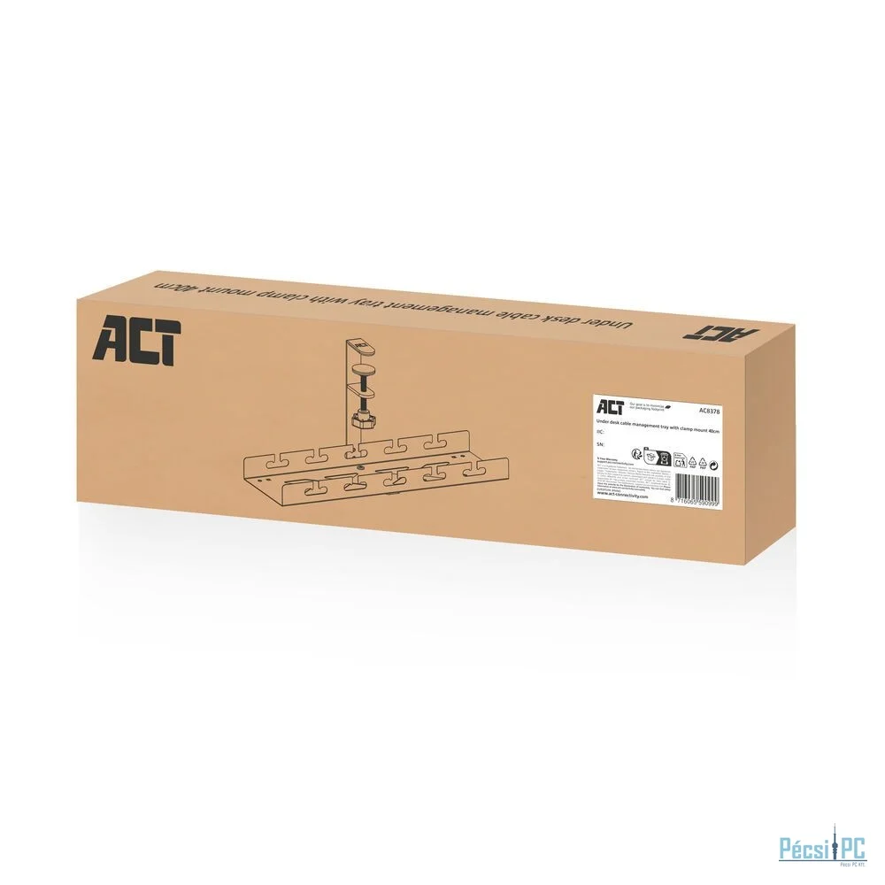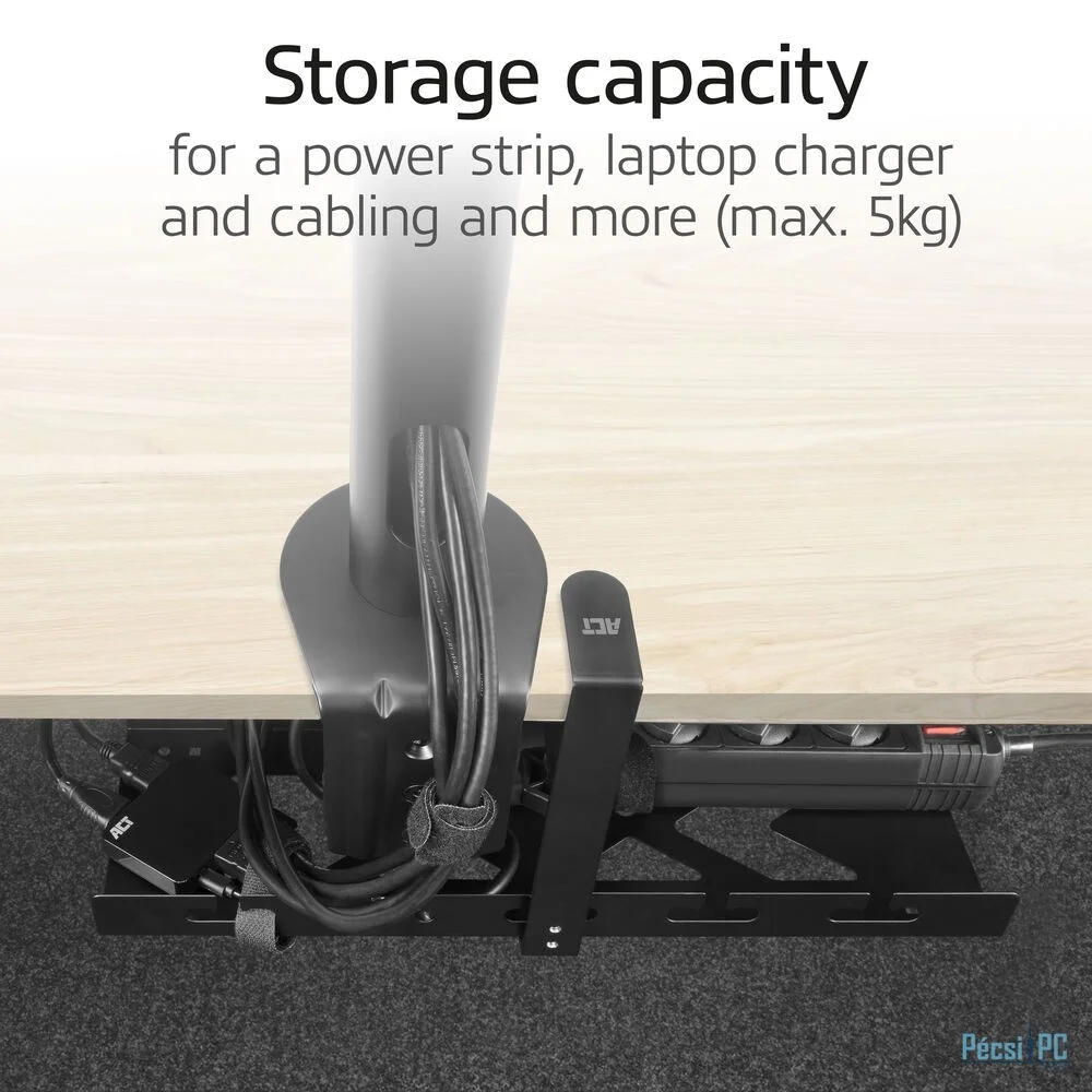 Az AC8378 fém kábelrendezo tálca rendben és tisztán tartja az asztalát, és rendszerezi a kábelezést. A tálca szélessége 40 cm, és elegendo tárolókapacitást biztosít a hosszabbító, a laptop tölto, a kábelek és egyéb eszközök tárolásához. A nyitott szerkezet ideális a szellozéshez és a kábelek elvezetéséhez. És a legjobb: szerelés csavarozás és fúrás nélkül. A tálcát a mellékelt szorítóbilinccsel könnyedén rögzítheti az asztal alá (max. vastagság 50 mm). Az AC8378 szorítóbilinccsel ellátott monitor karral is használható.