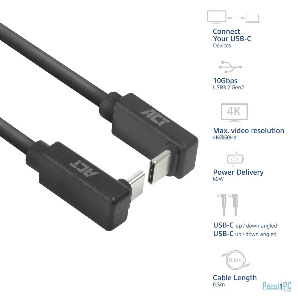 Az USB 3.0 Type-C® kábel sokoldalú megoldás USB-C eszközök csatlakoztatásához, szögletes csatlakozóval a nagyobb kényelem érdekében. A maximális adatátviteli sebesség 10 Gbps, így ez a kábel ideális olyan alkalmazásokhoz, amelyek gyors és megbízható adatátvitelt igényelnek. Az USB-C kábel mindkét végén 90°-os felfelé/lefelé szögletes csatlakozóval rendelkezik, így rugalmasan használható különböző csatlakozási helyzetekben. A kábel támogatja a 60 W-os tápellátást és a DisplayPort Alternate módot, maximális felbontása 4K@60Hz.