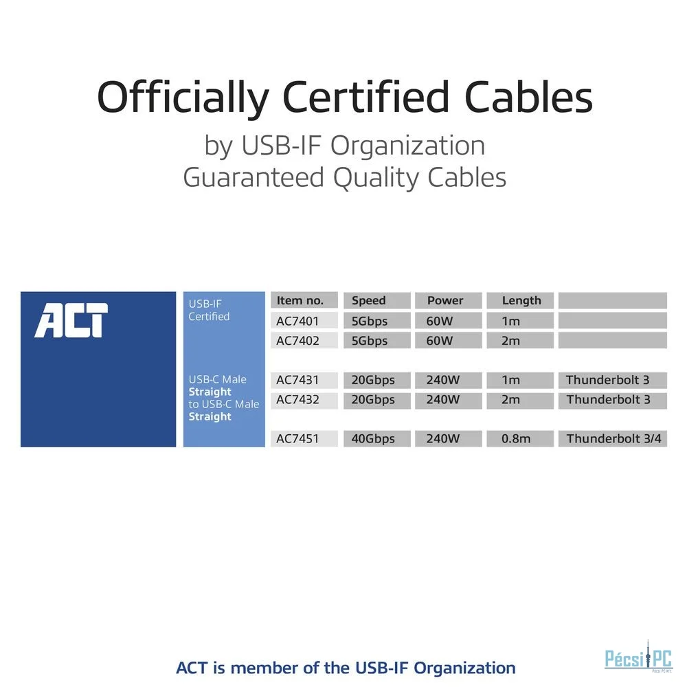 Az AC7432 hivatalosan az USB-IF vállalat által tanúsított. A kábelt az USB-IF a legmagasabb szabványok szerint tesztelte. A hivatalos USB-IF logó megtalálható a csatlakozón. Az ACT tagja az USB Implementers Forum, Inc.