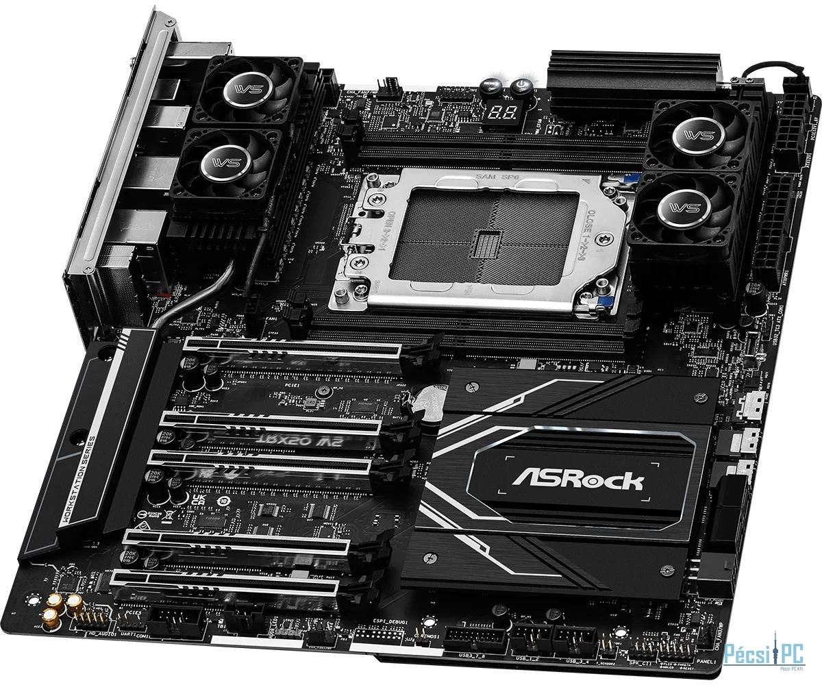 TR5, AMD TRX50, 4xDDR5, Max:7600MHz, Max:1024GB, 5xPCIE16, 4xSATA3, 6xUSB3.2, 2xUSB3.2C, 7.1, SPDIF optikai kimenet, 10Gb/s LAN, 2.5Gb/s LAN, WiFi, Bluetooth, 1xHyper M.2, 1xBlazing M.2, E-ATX