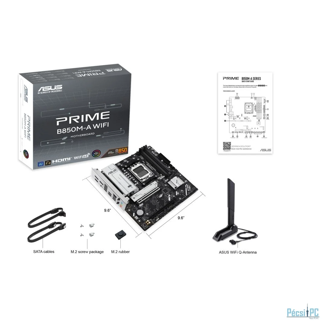 AM5, AMD B850, 4xDDR5, Max:5600MHz, Max:256GB, 2xPCIE16, 4xSATA3, RAID, 4xUSB, 2xUSB3.1, 2xUSB3.2, HDMI, DisplayPort, 7.1, 2.5Gb/s LAN, WiFi, Bluetooth, 3xM.2, Micro-ATX