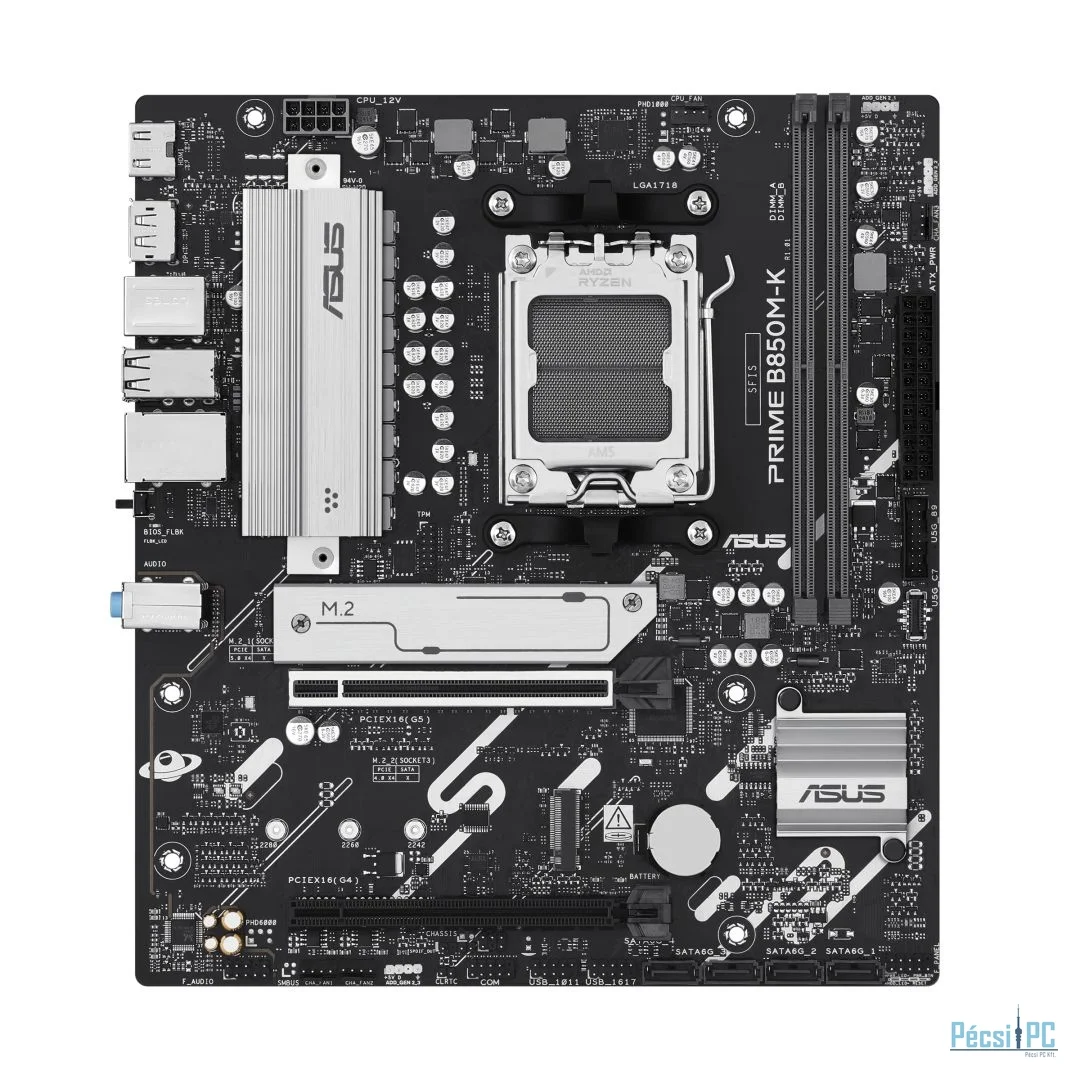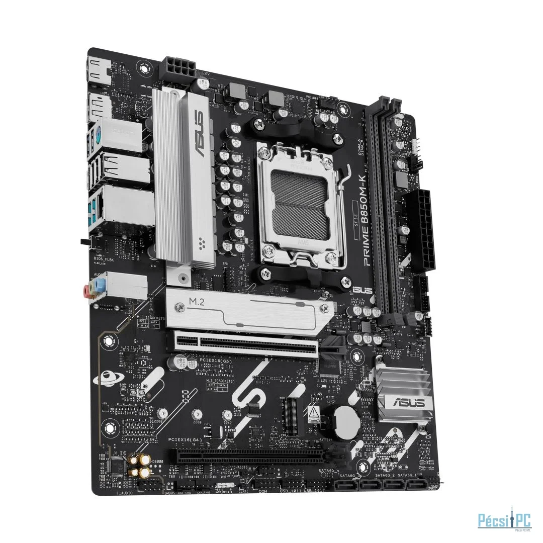 AM5, AMD B850, 2xDDR5, Max:5600MHz, Max:128GB, 2xPCIE16, 4xSATA3, RAID, 2xUSB, 2xUSB3.1, 2xUSB3.2, HDMI, DisplayPort, PS2:1 db, 7.1, 2.5Gb/s LAN, 2xM.2, Micro-ATX