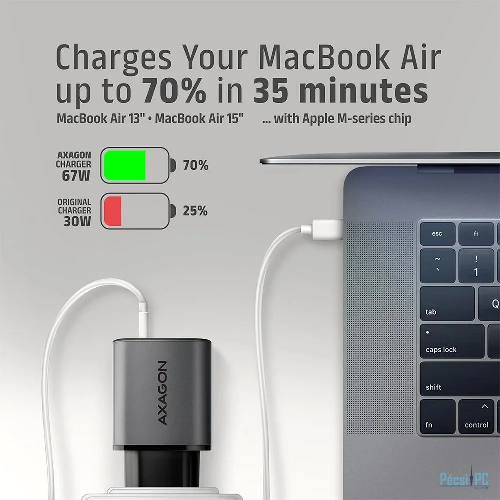 Az AXAGON ACU-PQ67D GaN utazási fali töltő lehetővé teszi akár két mobil eszköz egyidejű gyors töltését. A teljes 67 W kimeneti teljesítménynek köszönhetően a töltő a lehető legnagyobb sebességgel tudja tölteni a laptopokat, táblagépeket, telefonokat és egyéb mobil eszközöket. Az adapter nemcsak szabványos USB-A csatlakozóval, hanem fordítható USB-C csatlakozóval is rendelkezik. A tiszta LCD kijelzőn látható az aktuális töltési teljesítmény.