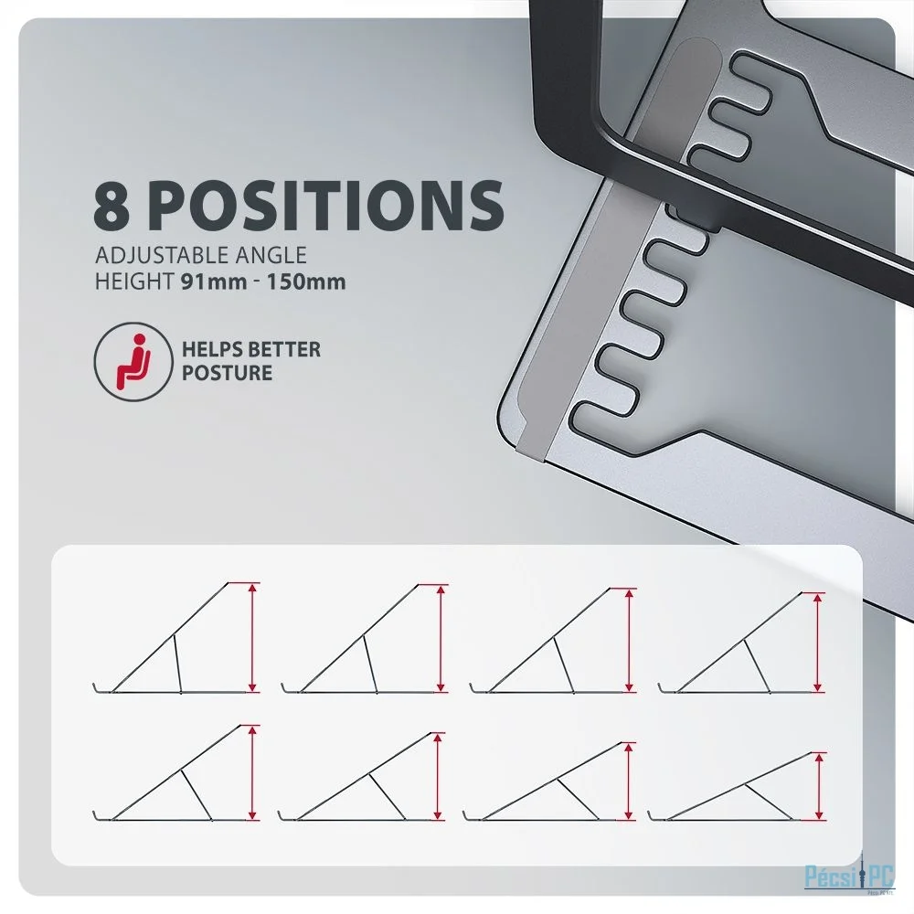 Nagy előnye az akár nyolc pozícióba történő állíthatóság. Ennek köszönhetően a notebook a 91 és 150 mm magasságba emelhető. Ezáltal egy további, a megfelelő szemmagasságban lévő munkakörnyezetet kap, ami nagymértékben javítja az ergonómiát és a munkakomfortot, miközben növeli a produktivitást.