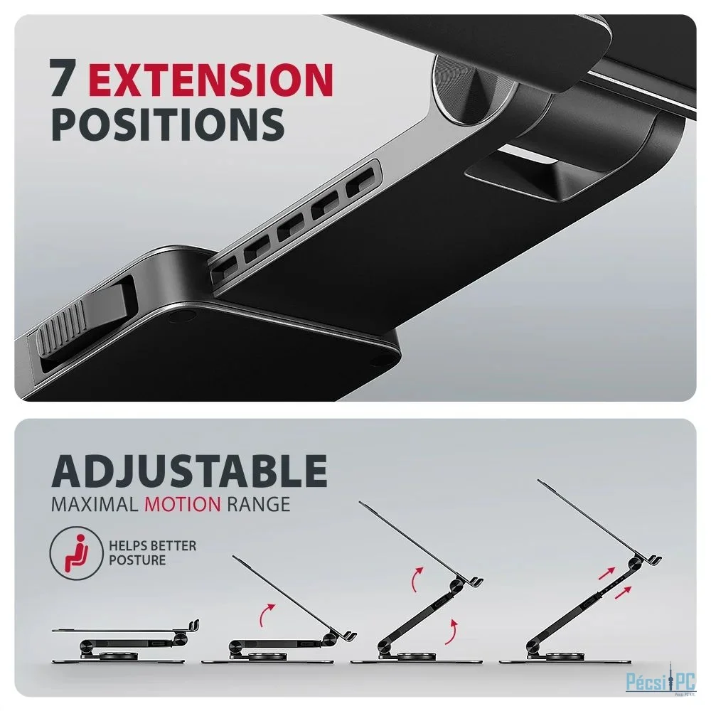 Egyedülálló funkció a kioldás gátlóval ellátott kihúzható kar, amely a hét állítható pozíciónak köszönhetően akár 6 cm-rel is meghosszabbítható. Így a laptopot könnyedén beállíthatja az Ön igényeinek megfelelő, optimális magasságba és szemtől való távolságba. Az okos dupla zsanérmegoldás a képernyő magasságának zökkenőmentes beállítását teszi lehetővé, hogy egy szintben legyen a külső monitorral. Ezáltal a megfelelő szemmagasságban további munkaterületet kap, ami nagymértékben javítja az ergonómiát, növeli a kényelmet és fokozza a termelékenységet.