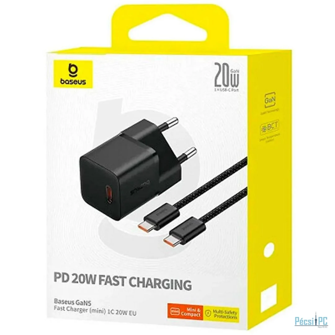 Hálózati töltő, 1xUSB-C, Kábel csatlakozó USB-C , 5V/9V, 3A, 20W, QC, Black
