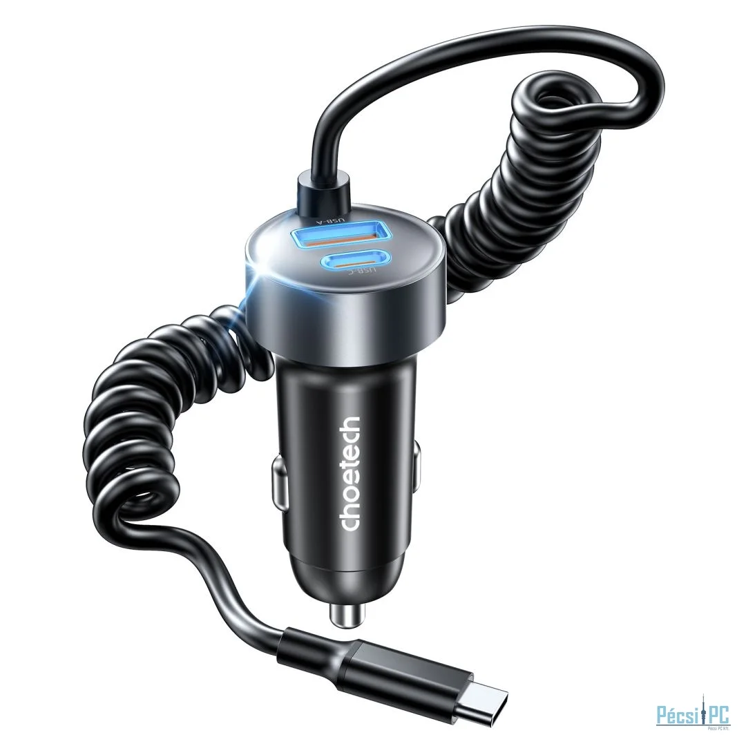 Autós töltő, 1xUSB-A, 1xUSB-C, Kábel csatlakozó USB-C , 5V/9V/10V/12V, 3A, 65W, PD, Black