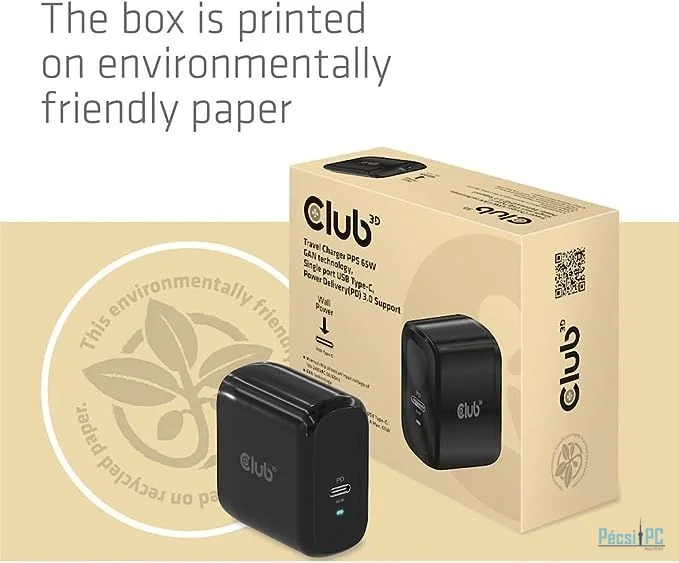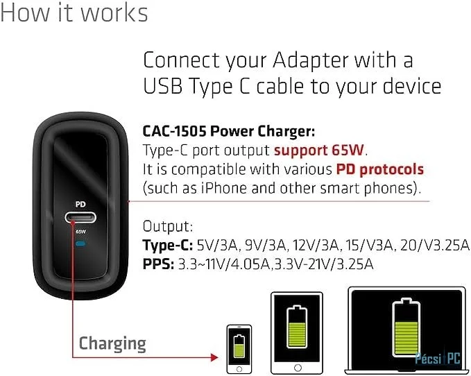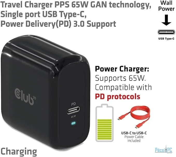 Hálózati töltő, 1xUSB-C, Kábel csatlakozó USB-C , 5V/9V, 3A, 65W, PD, Black