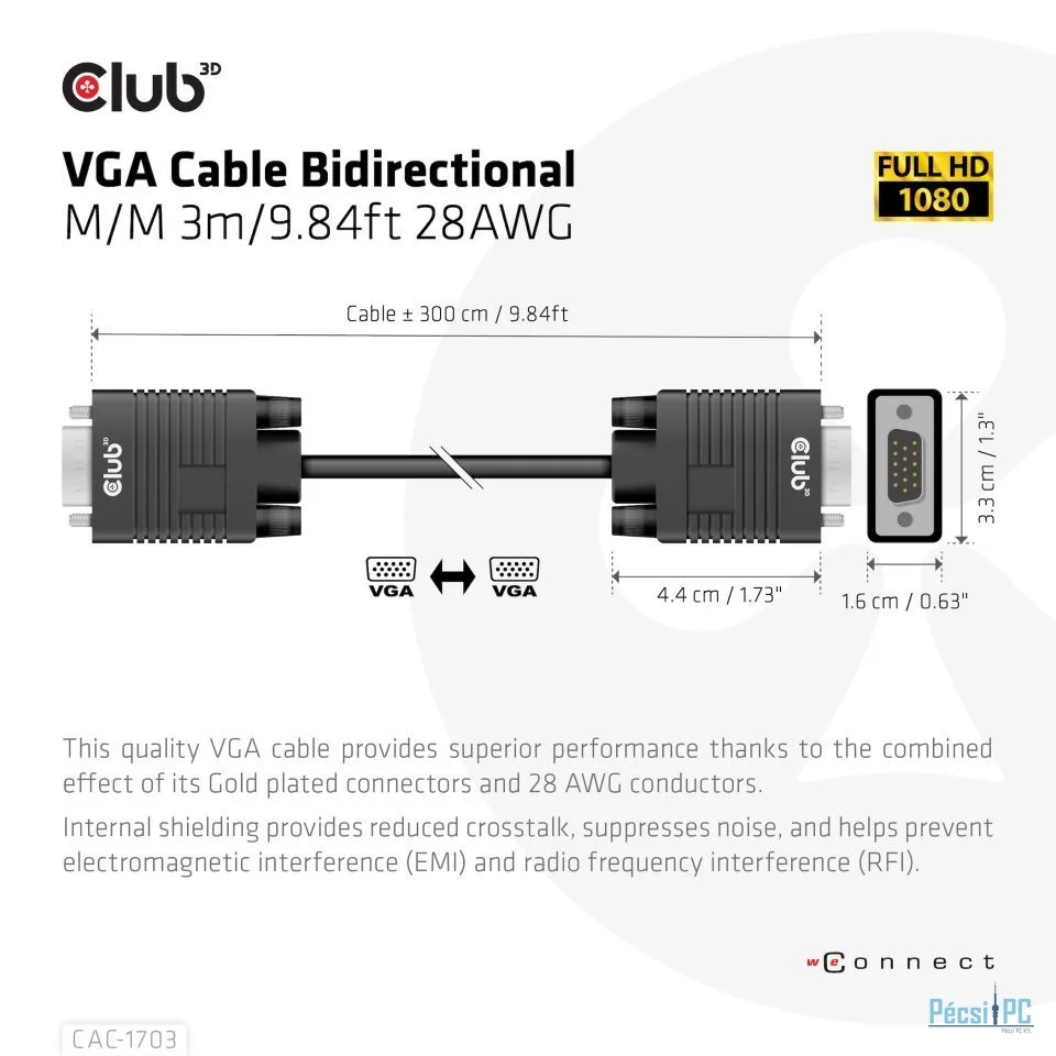 Videó kábel, VGA, VGA, FullHD, Male/Male, 3m, Black