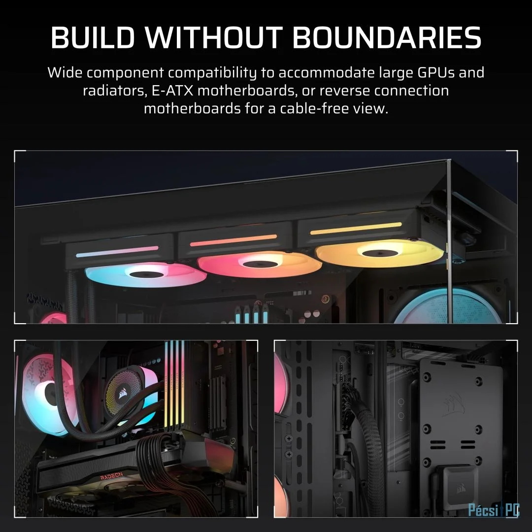 E-ATX, Black, 2x3,5", 2x2,5", 2xUSB3.2, 1xUSB Type-C, Audio, Táp nélkül, 506x460x240mm, Ventilátor:3x12cm, Tempered glass window, RGB, Gamer