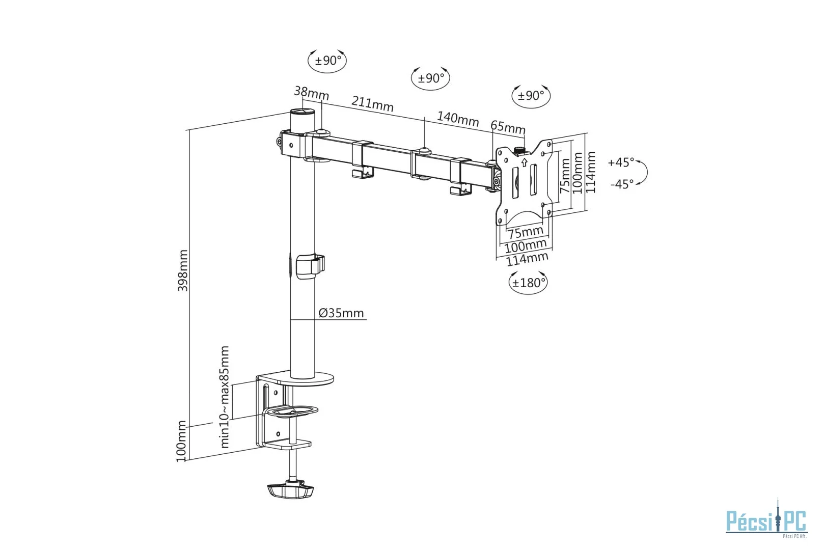 A DIGITUS® univerzális monitortartójával kényelmesen rögzíthet egy 15" - 32" méretű monitort az íróasztalára egy bilincses rögzítő segítségével. A gyorskioldó funkció a monitor felszerelését is megkönnyíti. A VESA-konzolt egyszerűen behelyezi a megfelelő tartóba, és egy csavarral rögzíti. Nagy erőfeszítés nélkül, igényei szerint rendezheti el a monitort, és elforgathatja, megdöntheti vagy elforgathatja a monitort, például a portré módban lévő monitorok esetében. Akár 31,5 cm-es magassági beállításokat is végezhet. A monitor kábelei a mellékelt kábelrendező segítségével rendezetten tárolhatók. Tegyen jót magának és egészségének azzal, hogy monitorát testének és ülőhelyzetének megfelelően optimálisan beállítja.