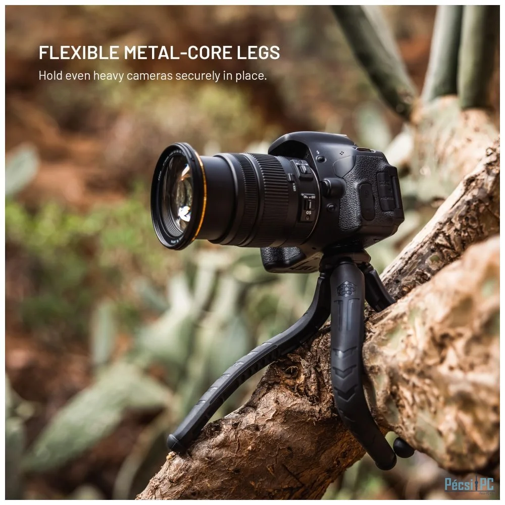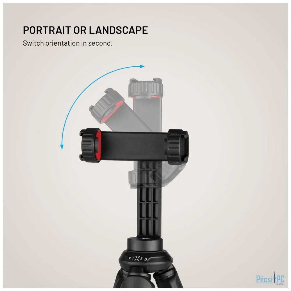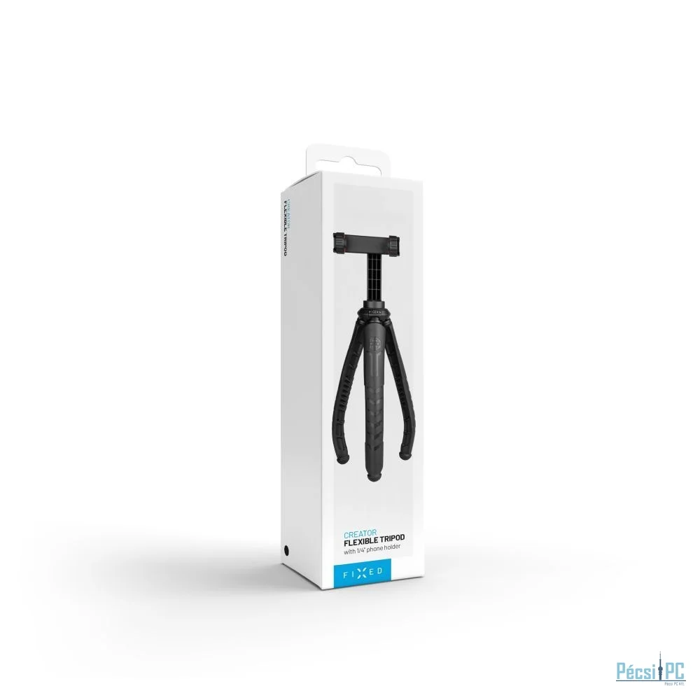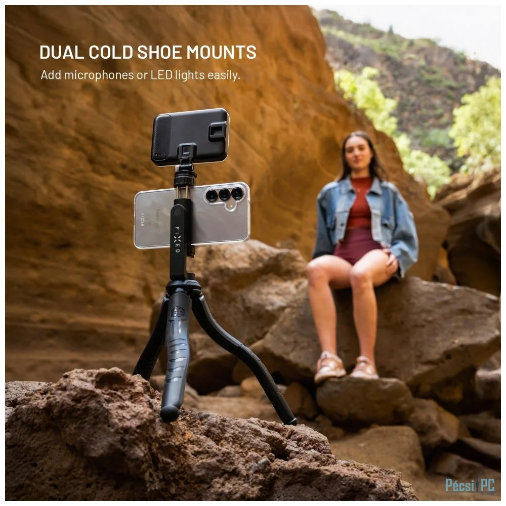 A rugalmas FIXED Creator állvány ideális segítője a fényképezésnek, filmezésnek és streamingnek bárhol a terepen vagy otthon. Lábai hét acélszállal vannak megerősítve, amelyek tetszés szerint hajlíthatók, vagy biztonságosan körbetekerhetők ágak, korlátok vagy oszlopok körül. Így még a nem szokványos helyeken is könnyedén elkészítheti a tökéletes felvételt. A gumírozott felület maximális stabilitást biztosít, és megakadályozza a csúszást a sima felületeken. Az állványhoz tartozik egy állítható tartó, amely akár 6,9" méretű telefonok tartására is alkalmas, és amely megvédi a bilincs belső párnázatát a karcolásoktól. A forgócsuklónak köszönhetően a tartó vízszintes vagy függőleges helyzetbe állítható a legjobb szögben. A tartó két praktikus hidegcipő-adapterrel is rendelkezik mikrofon vagy LED-lámpa rögzítéséhez. A tartó eltávolítása után az univerzális 1/4"-os menetet használhatja a kompatibilis fényképezőgépek, akciókamerák vagy más tartozékok rögzítéséhez. Kompakt méreteinek és kis súlyának köszönhetően univerzális állvány mindenkinek, aki bárhol és korlátozások nélkül szeretne kreatív felvételeket készíteni.