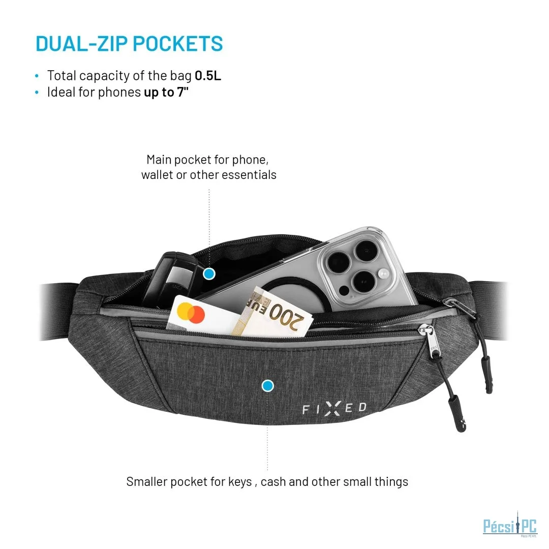0,5 literes űrtartalmú sport övtáska két cipzáras zsebbel. 7 hüvelykes méretig alkalmas telefonok, kulcsok és egyéb apróságok tárolására. Tartós és lélegző anyagból készült, rugalmas, állítható pánttal és fényvisszaverő elemekkel a biztonságos szabadtéri mozgás érdekében.