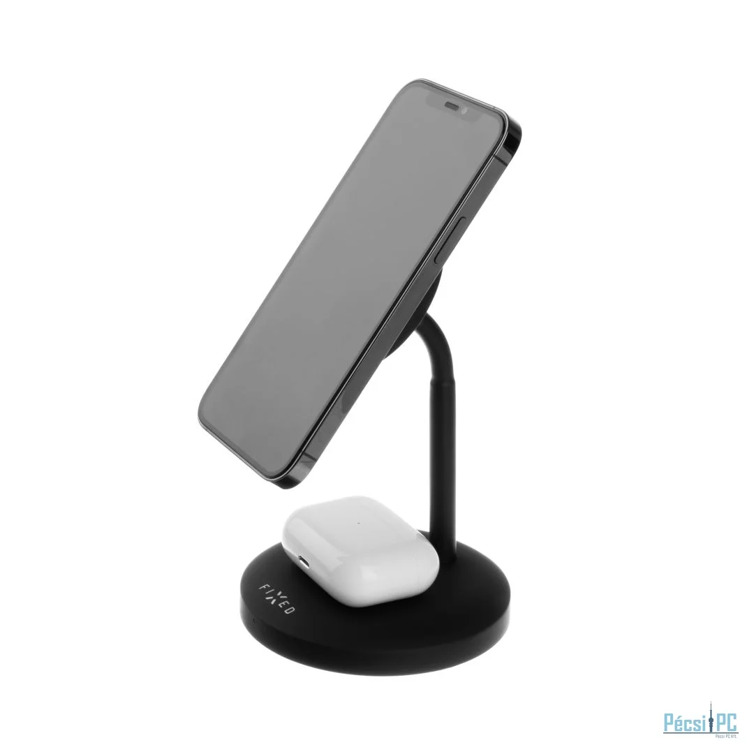 A FIXED MagStand egy vezeték nélküli töltéssel és a MagSafe technológia támogatásával rendelkező állvány, amely elegánsan megoldja a legújabb iPhone és az Airpods vagy más kiegészítők töltésének problémáját. A telefon elhelyezésekor a töltőpadon lévő mágnesek a MagSafe segítségével biztonságosan rögzítik az iPhone-t, és a vezeték nélküli töltés azonnal megkezdődik. Ráadásul a tartó zsanérjának és az állvány lábának rugalmas felső részének segítségével a telefont az ideális szögbe fordíthatja, így töltés közben szépen láthatóvá válik. A vezeték nélküli töltéshez szükséges második töltőtekercs az állvány talpában van elrejtve, és például az Airpods fejhallgató vagy más kiegészítők töltésére szolgál. A MagStand állvány egy 7,5 W teljesítményű tekercset kínál az iPhone gyors töltéséhez és 15 W-ot más kompatibilis okostelefonokhoz, az állványban lévő második töltőfelület 5 W-os teljesítménnyel tölt. Magát az állványt a csomagban található USB-C kábellel csatlakoztathatod a hálózathoz. A töltés megkezdését egy LED jelzi, amely idővel elhalványul. A FIXED MagStand praktikus töltőállomásként fog szolgálni az íróasztalodon és az éjjeliszekrényeden a mindennapokban.
