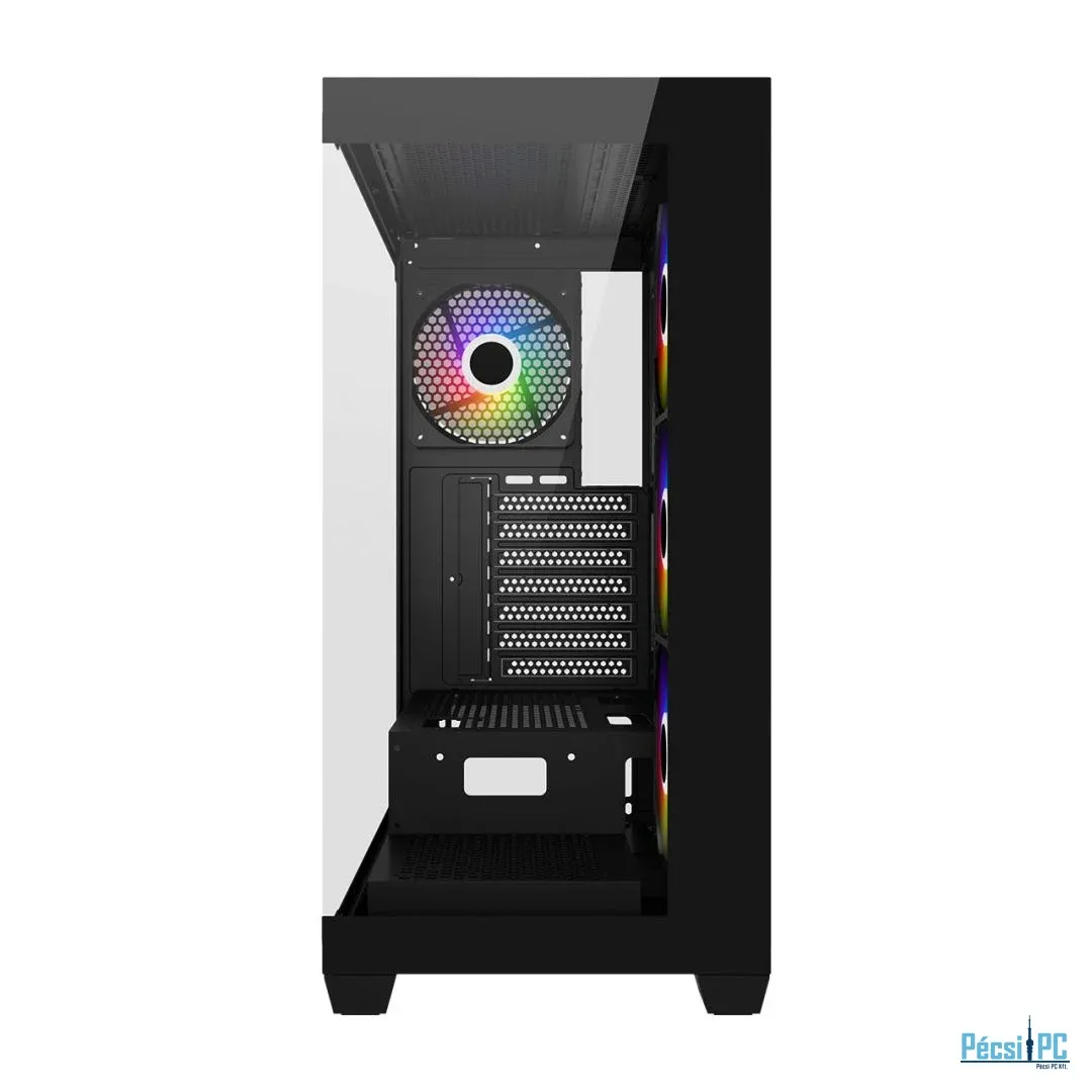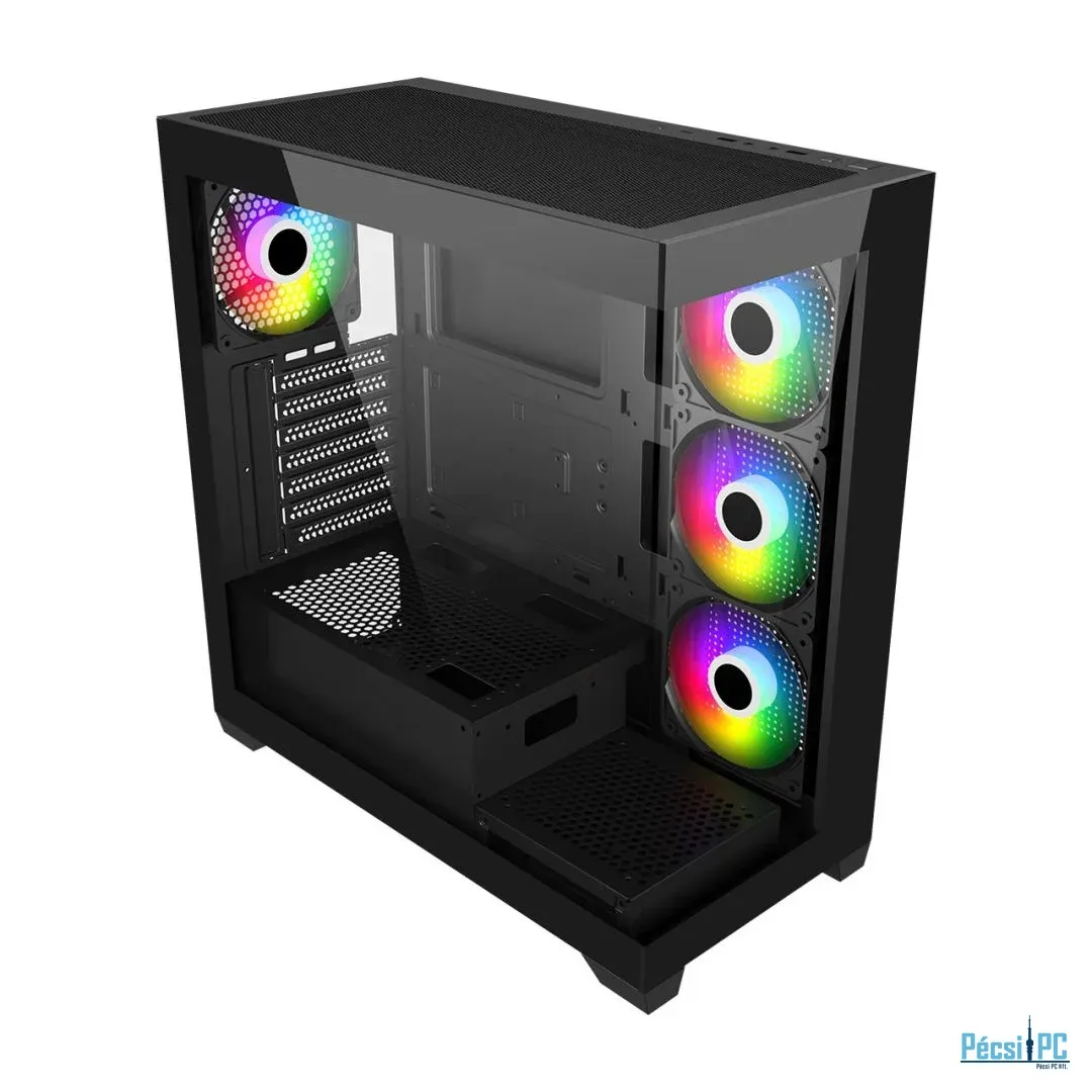 ATX, Black, 2x3,5", 1x2,5", 1xUSB2.0, 1xUSB3.0, 1xUSB Type-C, Audio, Táp nélkül, 454x434x218mm, Ventilátor:4x12cm, Tempered glass window, RGB, Gamer