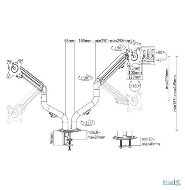 Gembird MA-DA2-02 Adjustable Tilting Desk 2-Display Mounting Arm 17”-32” Black