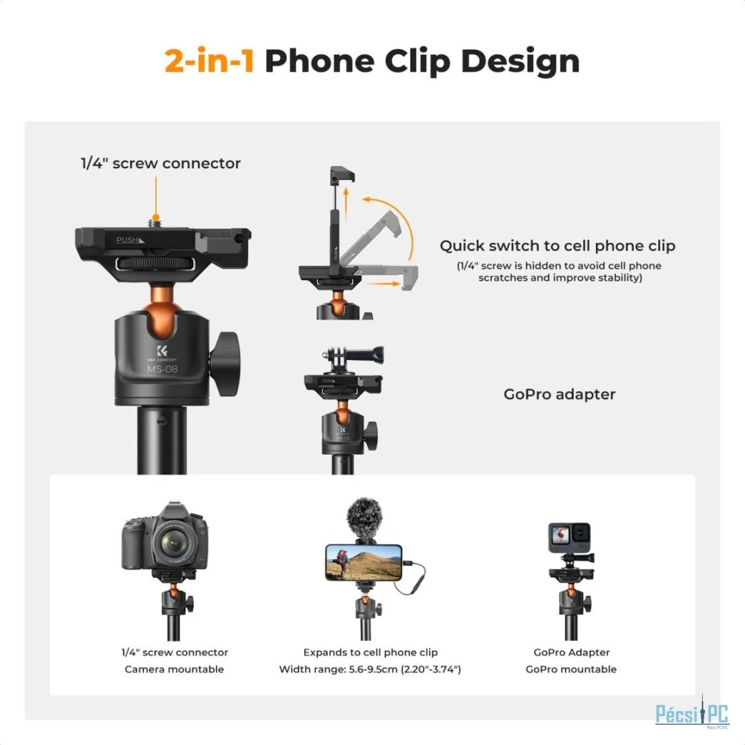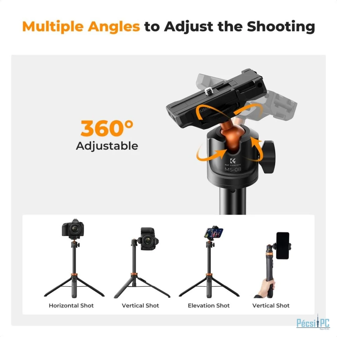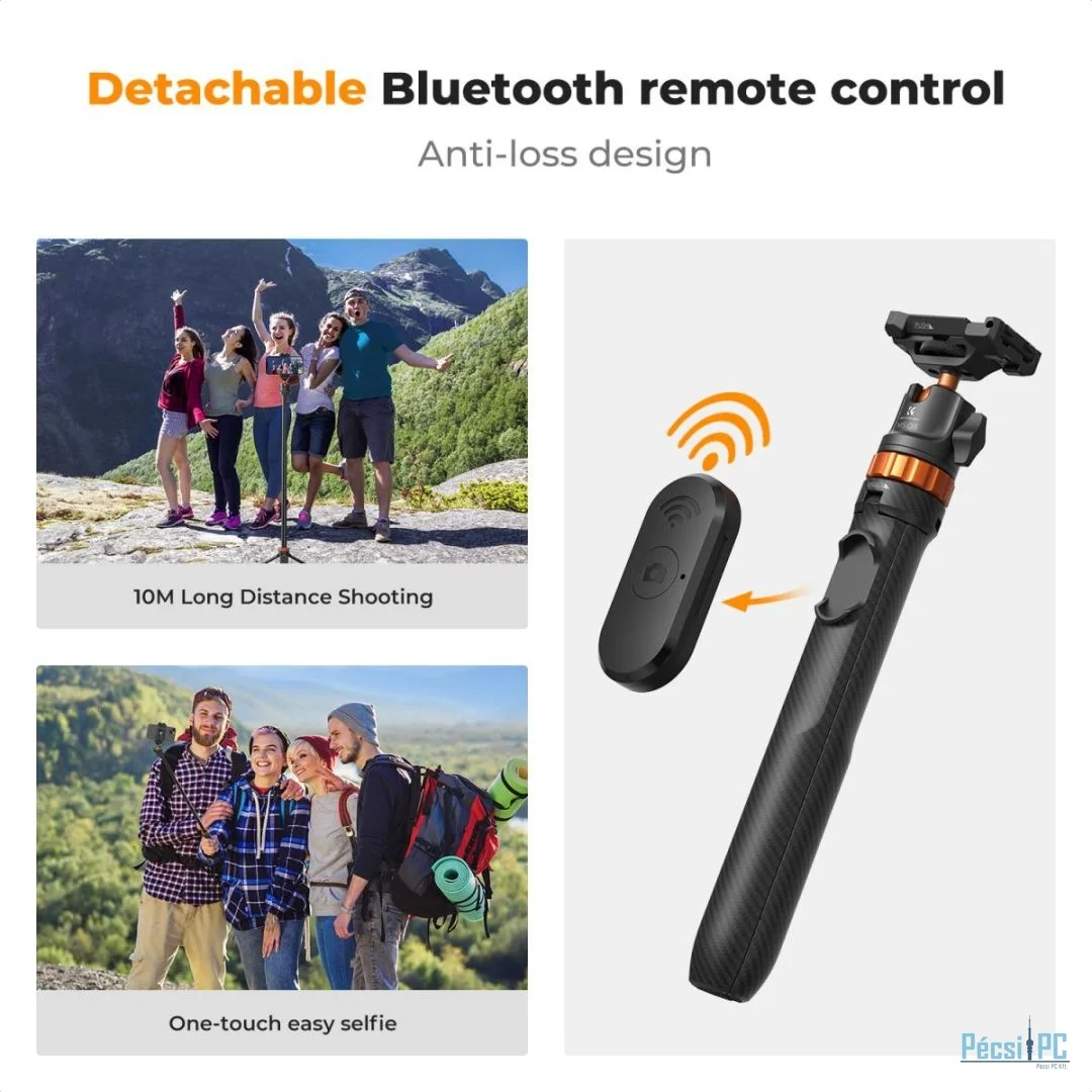 A maximális magasság eléri a 157,8 cm-t, és támogatja a 7 szakaszos lábbeállítást. Tetszés szerint állíthatja be a kívánt magasságot. Ez az állványfej 3 kg teherbírást támogat, és megfelel a legtöbb tükör nélküli fényképezőgép, mobiltelefon és egyéb felszerelés igényeinek. GoPro adapterrel felszerelve a GoPro, DJI Osmo Action és Insta 360 készülékek felvételi igényeihez igazítható. legjobb telefonos szelfibot A gömb alakú fej vízszintesen 360 fokban forgatható és függőlegesen 90 fokban dönthető, így lehetővé teszi a teljes körű felvételkészítést. Akár tájképeket, embereket vagy sportjeleneteket készít, könnyedén rögzítheti a kívánt szöget és látómezőt. A tetején található egy 1/4 hüvelykes csatlakozó, amely bármilyen eszközhöz csatlakoztatható a felvételek készítéséhez és támogatásához. A mindössze 97 g-os súlya miatt könnyen hordozható, és alkalmas utazáshoz és kültéri felvételek készítéséhez. Ingyenes Bluetooth távirányítót biztosítunk, amely jelszó nélkül gyorsan párosítható, és 10 méteres körzetben szabadon fényképezhet vagy videót rögzíthet. Folyamatosan 10 órán keresztül képes működni. Megjegyzés: A bluetooth távirányító csak mobiltelefonokhoz csatlakoztatható, fényképezőgépekhez nem.