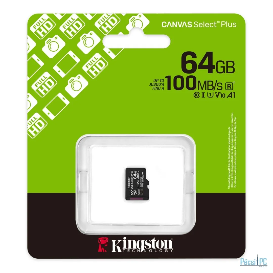 Kingston 64GB microSDXC Canvas Select Plus Gen3 Class 10 UHS-1 A1 V10 adapter nélkül