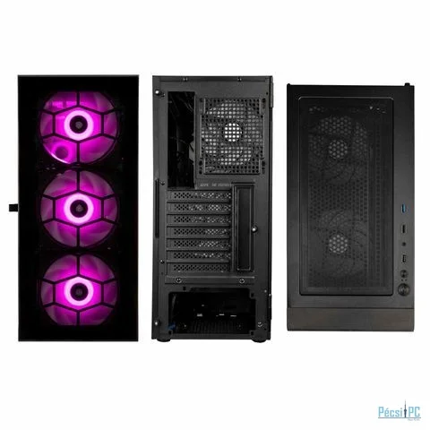 ATX, Black, 2x3,5", 2x2,5", 2xUSB2.0, 1xUSB3.0, Audio, Táp nélkül, 390x200x449mm, Ventilátor:3x14cm, 3x12cm, Tempered glass window, RGB, Gamer