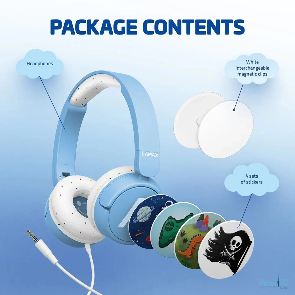 A fejhallgató csomag egy cserélhető, fehér mágneses kapcsos készletet tartalmaz, amit a gyermek tetszés szerint díszíthet matricákkal vagy rajzokkal.