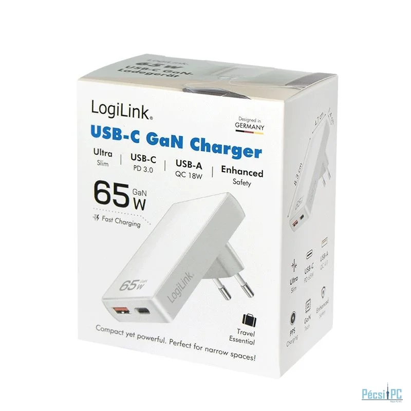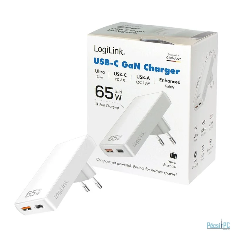 Logilink extra slim USB-A, USB-C 65W adapter White