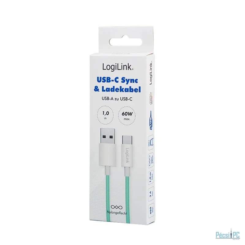 USB kábel, USB-A, USB-C, USB2.0, Male/Male, 1m, Green, Töltő és adatkábel, Szövetborítás