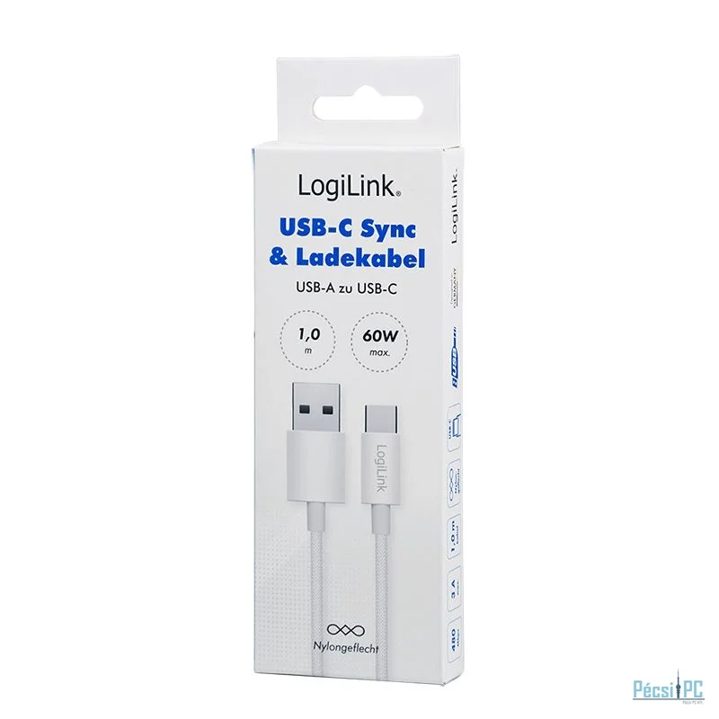 USB kábel, USB-A, USB-C, USB2.0, Male/Male, 1m, White, Töltő és adatkábel, Szövetborítás