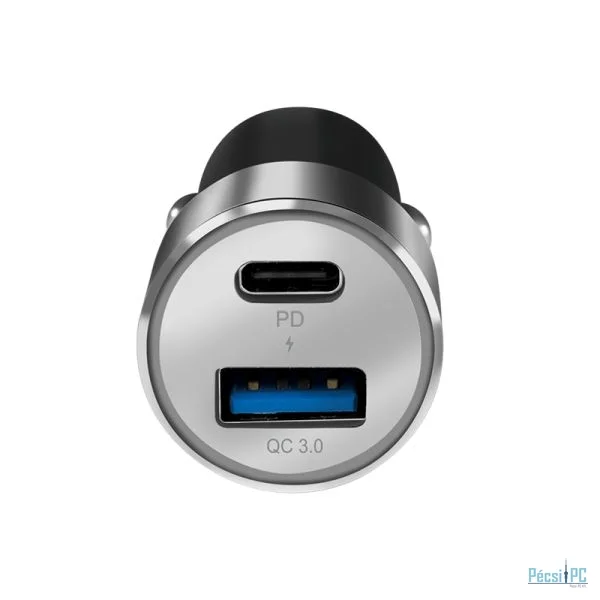 Autós töltő, 1xUSB-A, 1xUSB-C, 12V, 3A, 36W, QC, PD, Grey