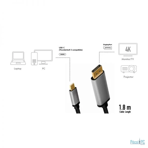 Videó kábel, USB-C, DisplayPort, Ultra HD 4K, Male/Male, 1,8m, Black