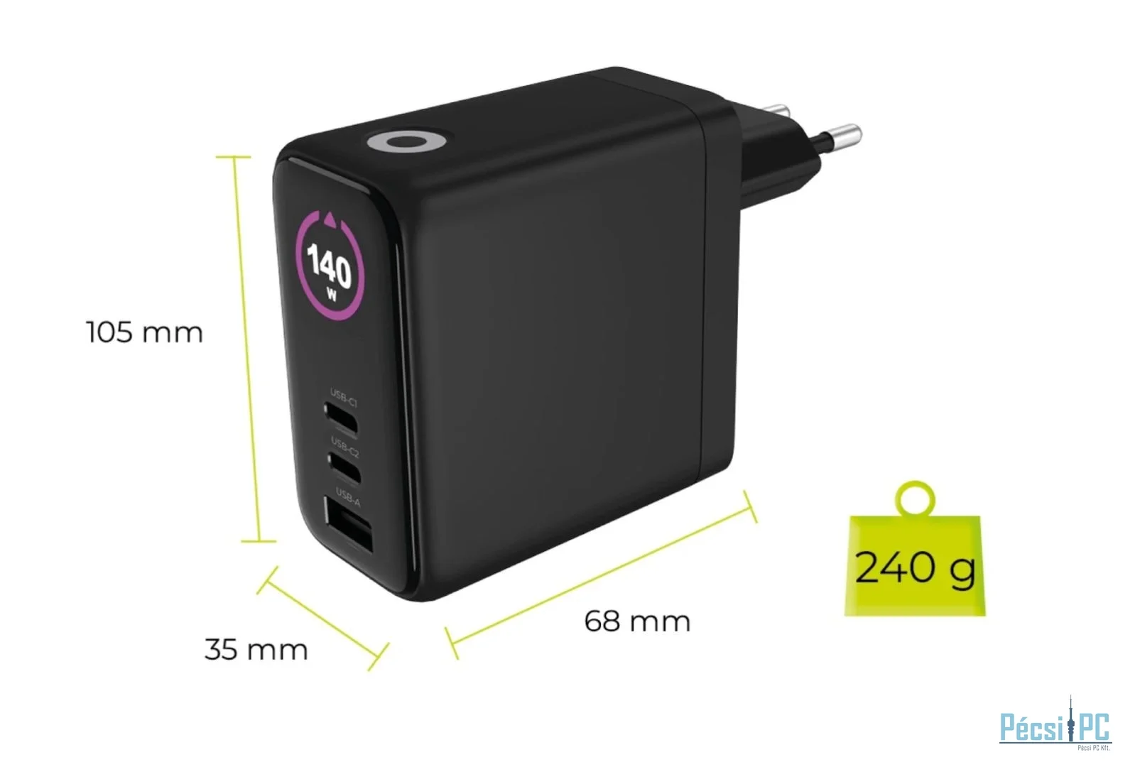 Adapter, 1xUSB-A, 2xUSB-C, 5V/9V/12V/15V/20V/28V, 5A, 140W, QC, PD, Black