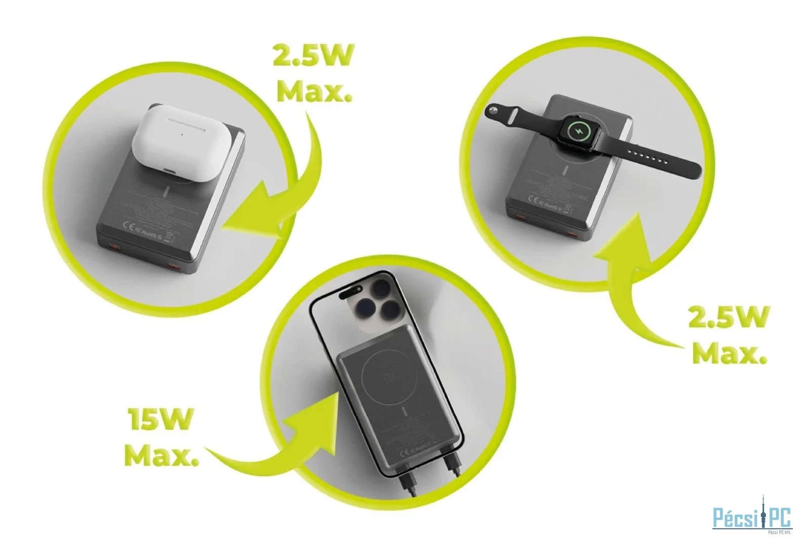 Az iPhone szabványos MagSafe töltése (akár 15 W) mellett a PowerBank az Apple Watch (2,5 W) és az AirPods (2,5 W) vezeték nélküli töltésére szolgáló technológiákkal is rendelkezik, így utazás közben csak egy eszközre van szüksége az összes készülékéhez.