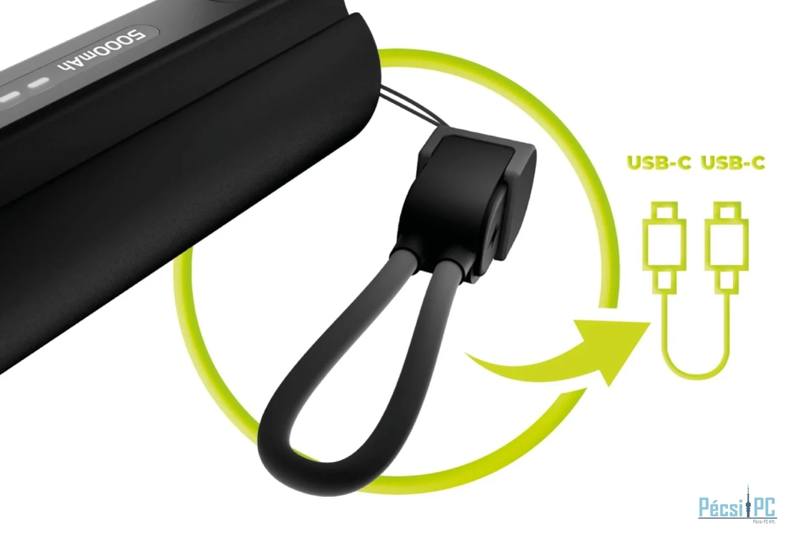 A beépített, hurok formájú USB-C kábellel mindig készen állsz a készülékeid feltöltésére.