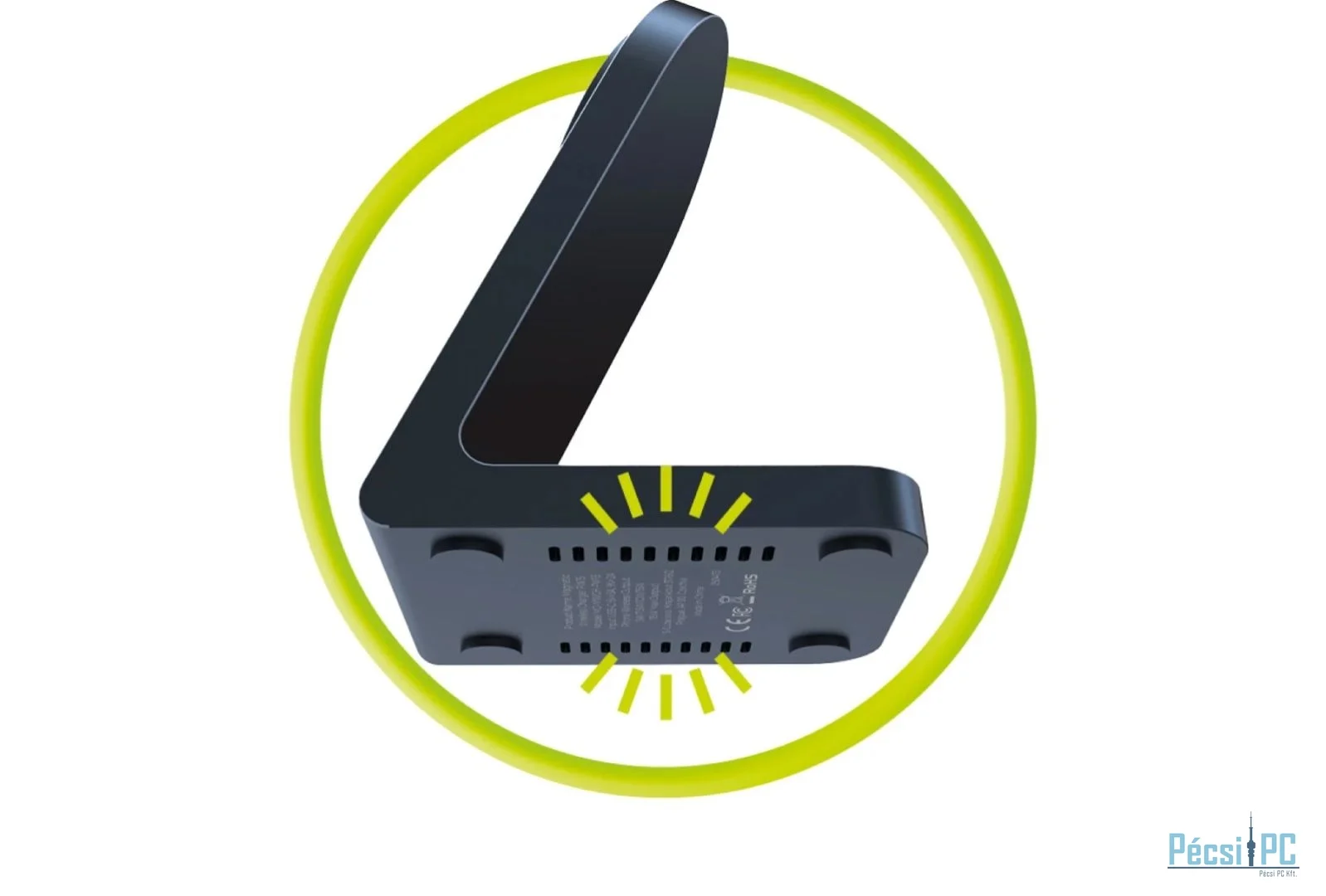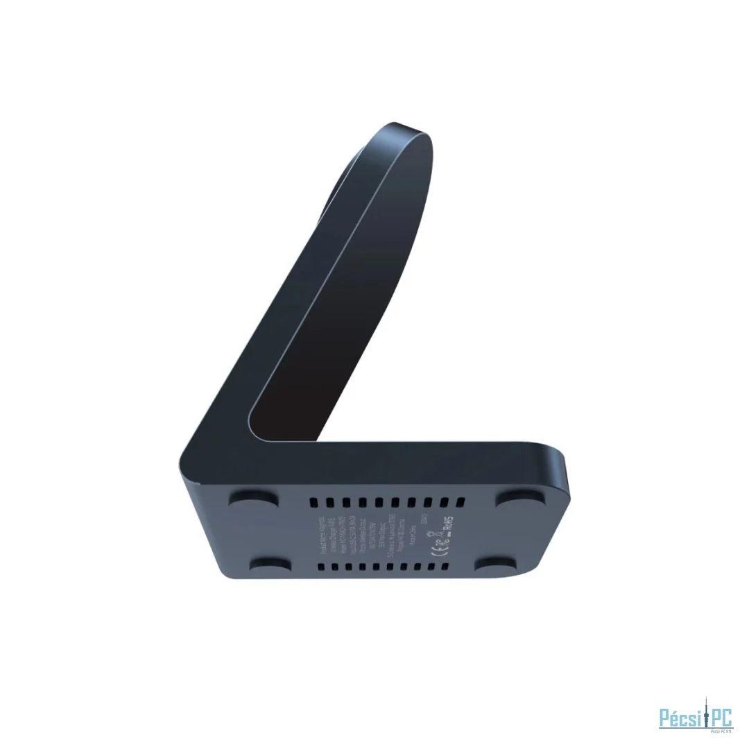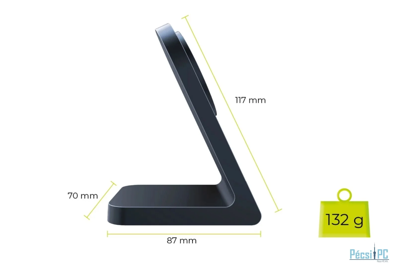 Modern design fekete színben, prémium anyagokkal (ABS). Kompakt méretek: 117 x 87 x 70 mm. Súly: 132 g. A töltőállomás a csomagban található USB-A-ból USB-C-be csatlakoztatható kábellel csatlakoztatható.