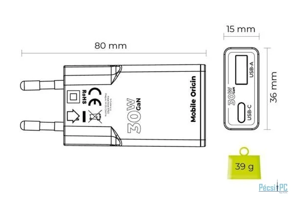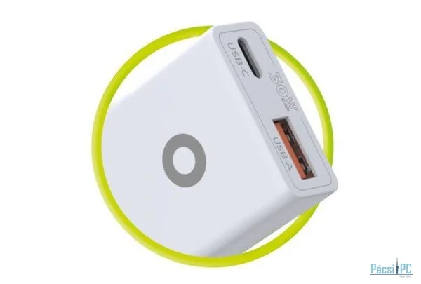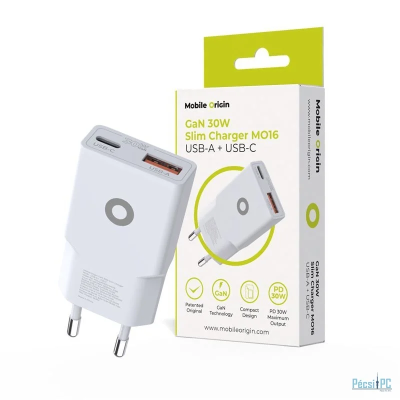 A GaN 30W-os Slim Charger MO16 USB-A + USB-C adapter gyors és hatékony töltést biztosít a legújabb GaN technológiával és Power Delivery támogatással.