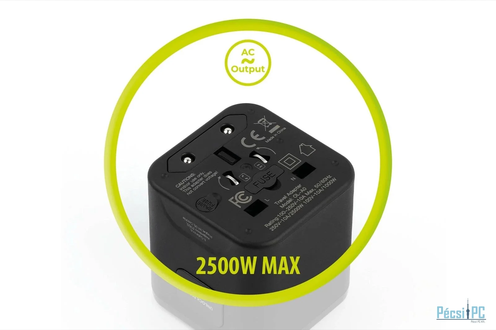 Kis mérete ellenére az adapter lenyűgöző teljesítményt nyújt. Akár 2500 W-os (250 V-os) váltakozó áramú terhelést is képes kezelni, ami még a legenergiaigényesebb készülékekhez is elegendő. Megjegyzés: Az adapter nem feszültségátalakító. Kérjük, győződjön meg arról, hogy készüléke támogatja a kettős feszültséget (100–250 V, 50/60 Hz).