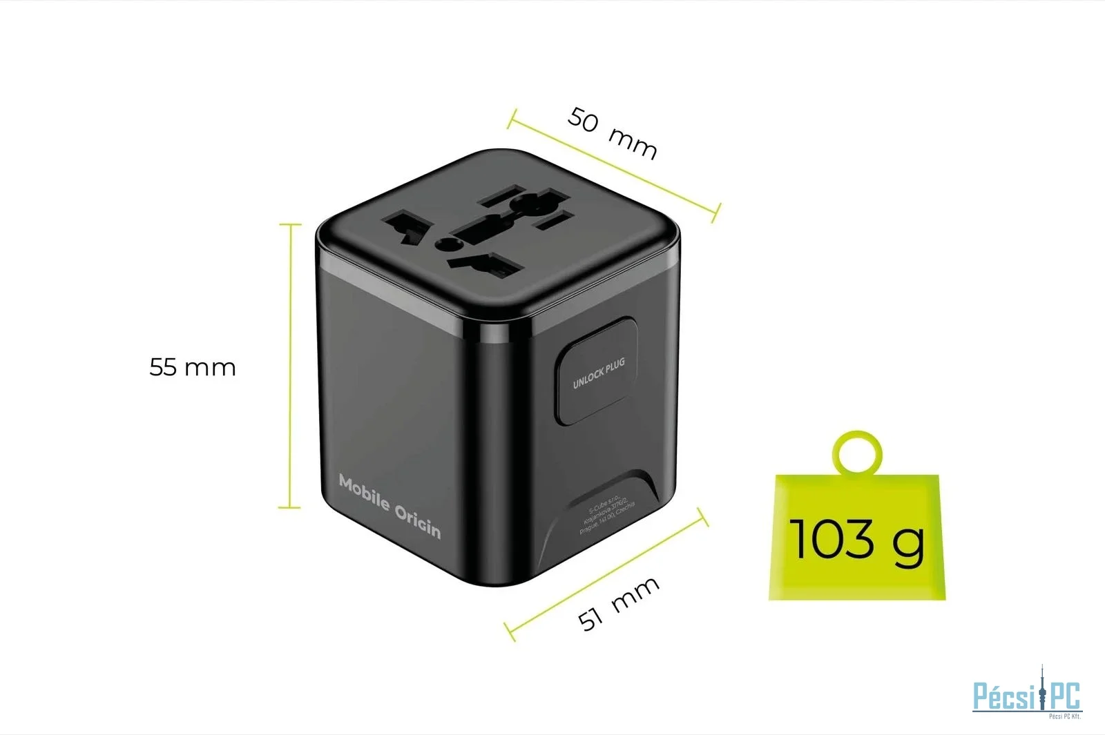 Az adapter mérete 55 x 51 x 50 mm, súlya pedig mindössze 103 gramm. Ezeknek a paramétereknek és a könnyű kialakításnak köszönhetően észre sem veszi, hogy a bőröndjében van.