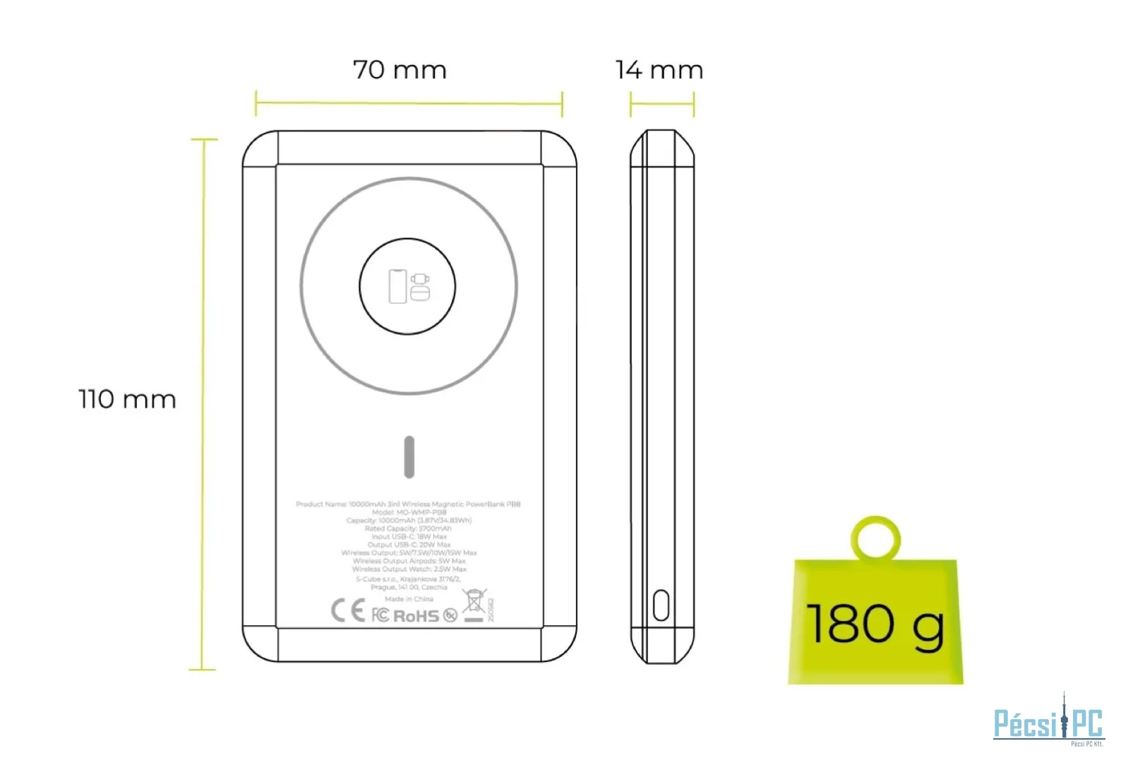 110 x 70 x 14 mm-es méreteivel és 180 g-os súlyával könnyen elfér egy táskában vagy zsebben – ideális utazáshoz és mindennapi használatra.