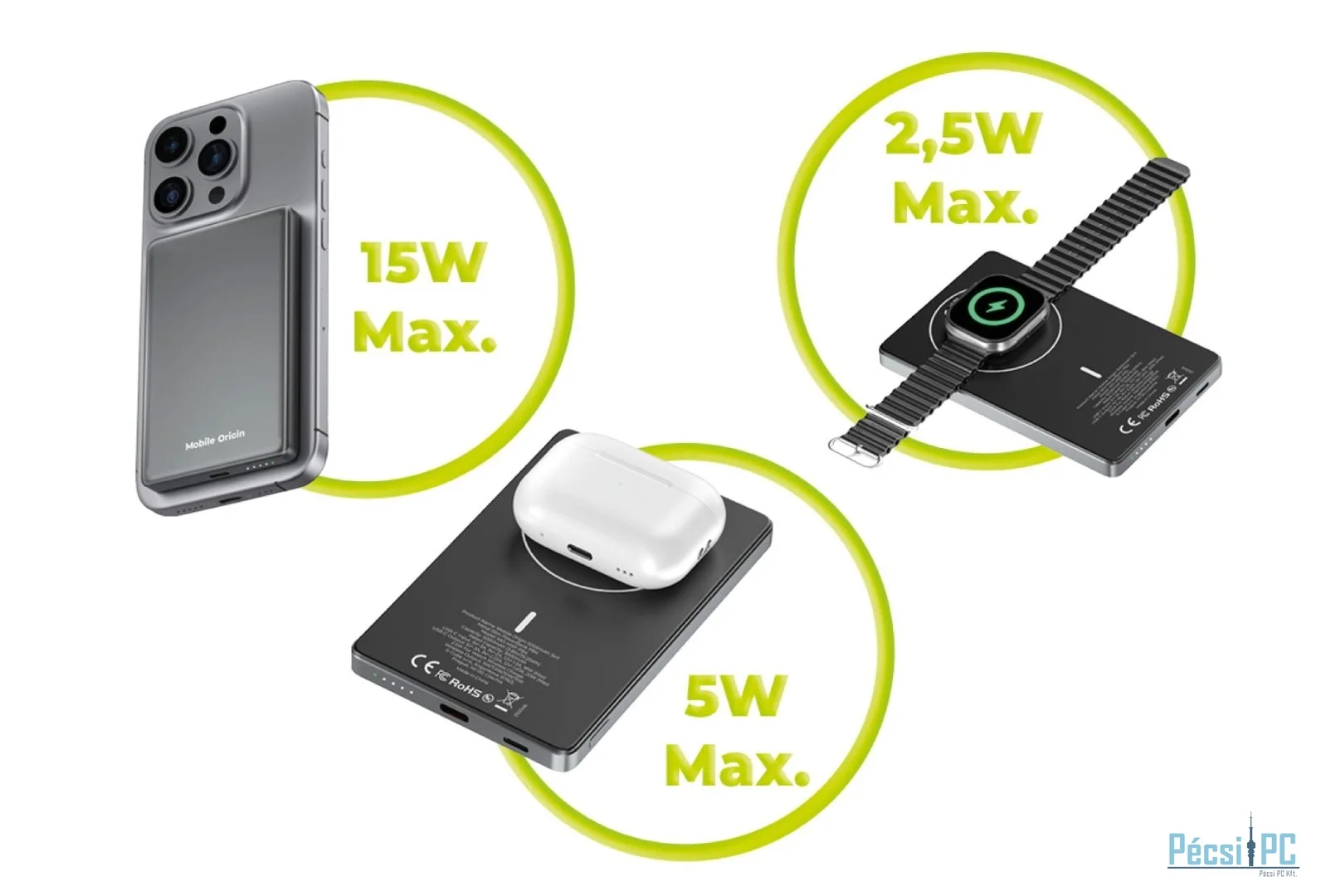 A vezeték nélküli telefontöltés akár 15 W-os, az Apple Watch töltése akár 2,5 W-os, az AirPods töltése pedig maximum 5 W-os teljesítményű.