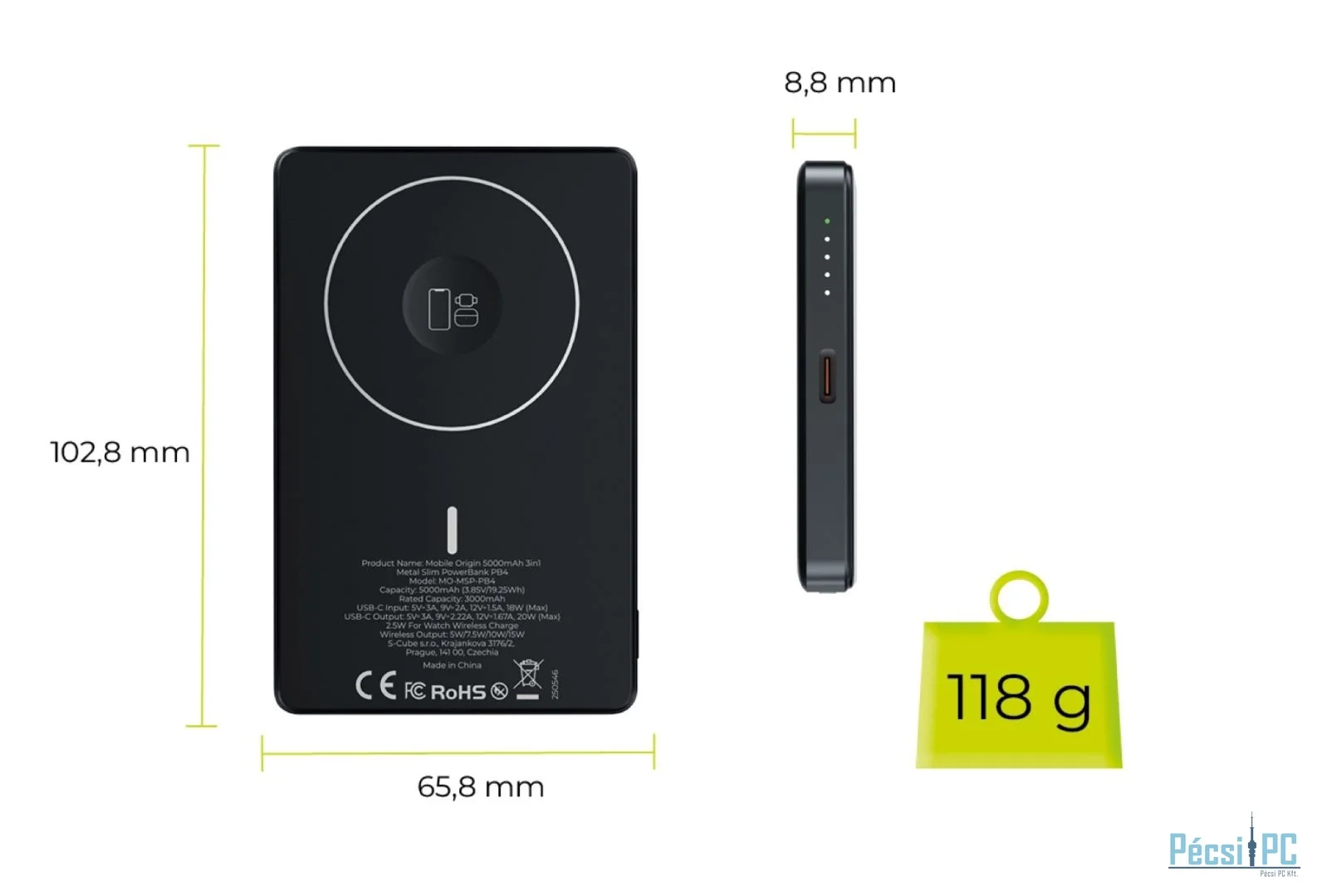 Ez a Power Bank 102,8 x 65,8 x 8,8 mm-es kompakt méretekkel rendelkezik, így ideális társ a mobil életmódodhoz. Könnyű, 118 g-os súlyának köszönhetően bárhová könnyen magaddal viheted - a táskádban, a hátizsákodban vagy akár a zsebedben is. Minimalista kialakítása és könnyű szerkezete biztosítja a mindennapos használat kényelmét, miközben elegendő energiát biztosít ahhoz, hogy útközben is tölthesse készülékét.