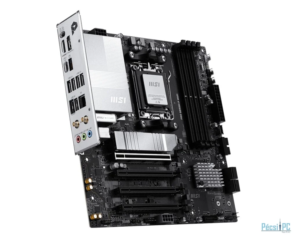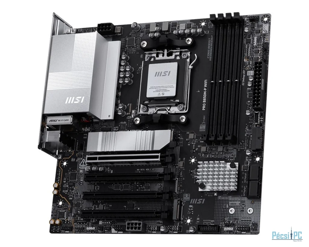 AM5, AMD B850, 4xDDR5, Max:5600MHz, Max:256GB, 4xPCIE16, 4xSATA3, RAID, 4xUSB, 2xUSB3, 1xUSB3.2C, HDMI, DisplayPort, 7.1, SPDIF optikai kimenet, 5Gb/s LAN, WiFi, Bluetooth, 3xM.2, Micro-ATX