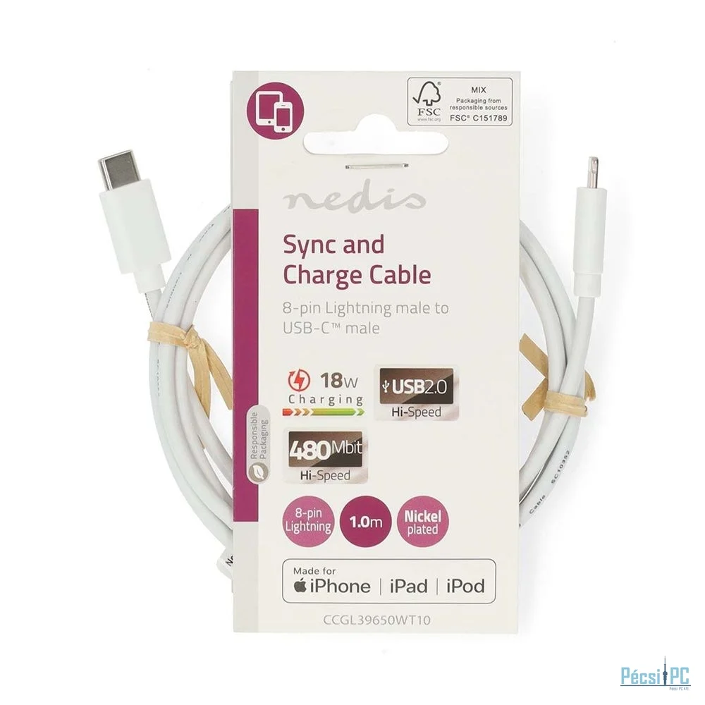 USB kábel, USB-C, Lightning, USB2.0, Male/Male, 1m, Whie, Töltő és adatkábel