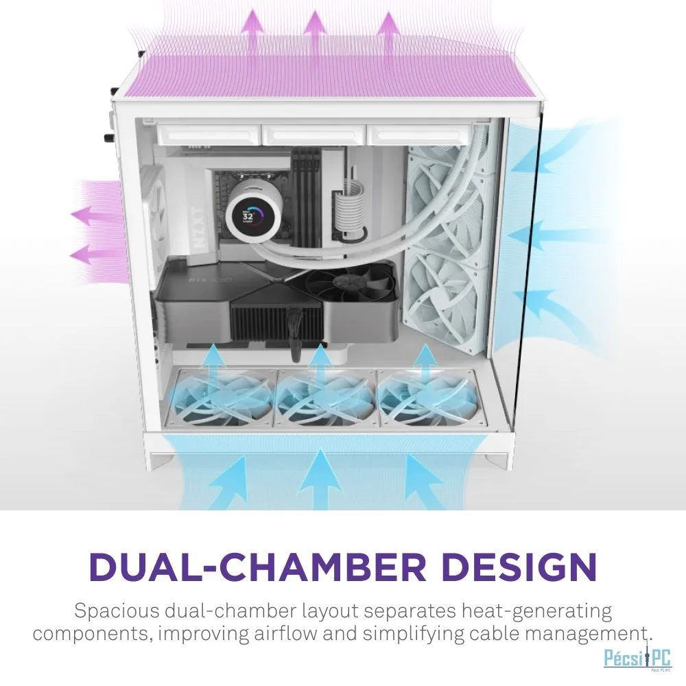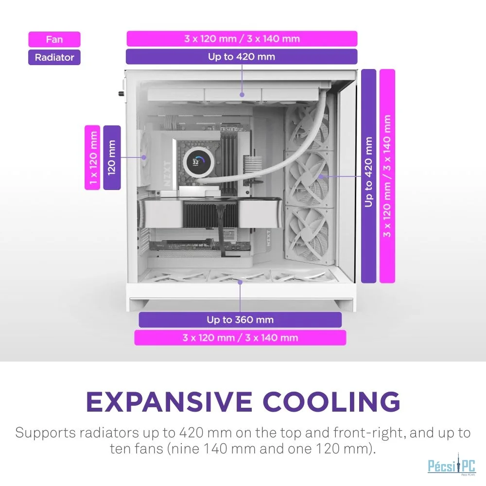 E-ATX, White, 2x3,5", 6x2,5", 2xUSB3.2, 1xUSB Type-C, Audio, Táp nélkül, 506x315x481mm, Ventilátor:3x14cm, 1x12cm, Tempered glass window