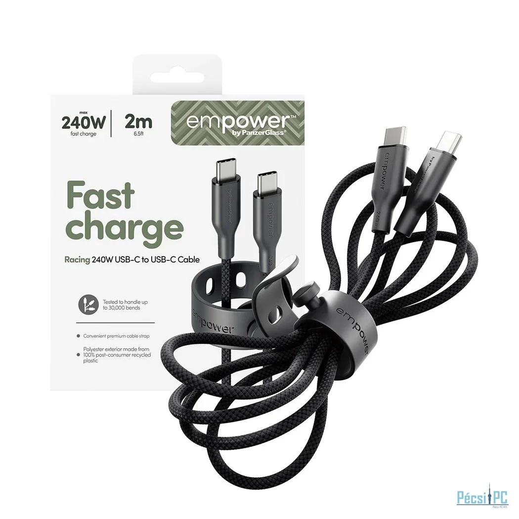 Empower by PanzerGlass® Racing USB-C-USB-C kábel akár 240 W-os teljesítményig azoknak készült, akik gyors töltést és kábelkezelést szeretnének. Használd MacBook, iPhone, Samsung, AirPods - vagy bármilyen más USB-C-vel rendelkező eszközhöz.