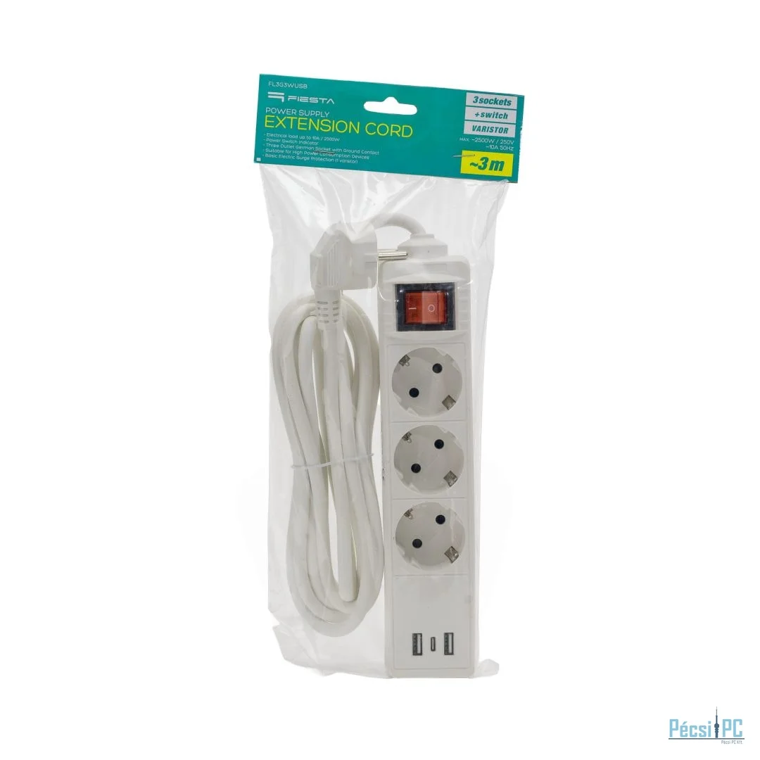Elosztó, 3xDIN, 3m, Kapcsoló, USB, White