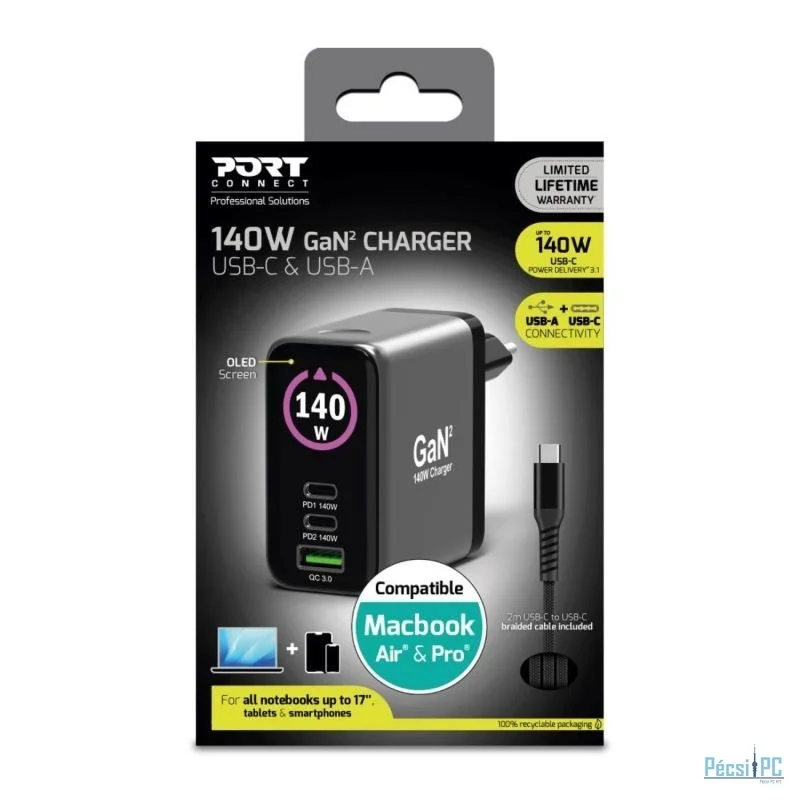 Port Designs GaN² wall charger 140W PD 3.1 OLED screen with 2M USB-C cable