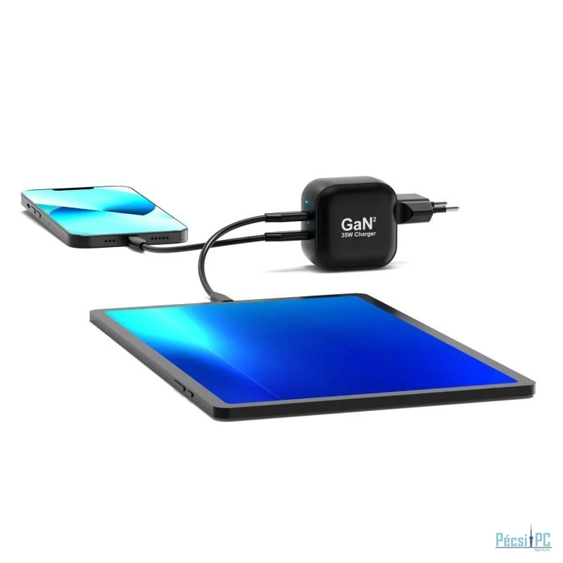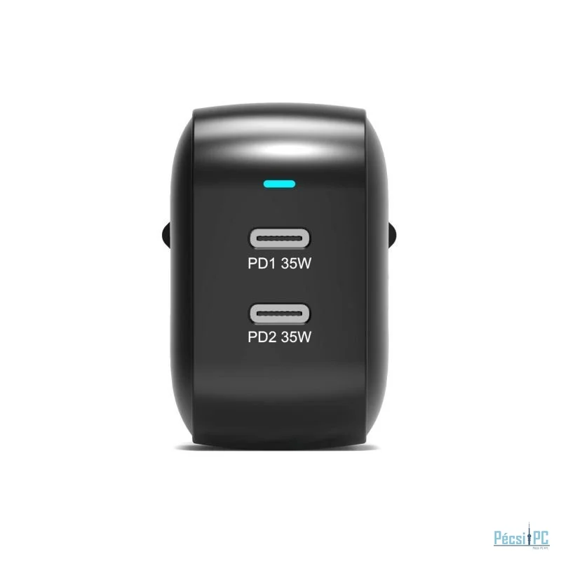 Hálózati töltő, 2xUSB-C, Kábel csatlakozó USB-C , 5V/9V/12V/15V/20V, 3A, 35W, PD, Black