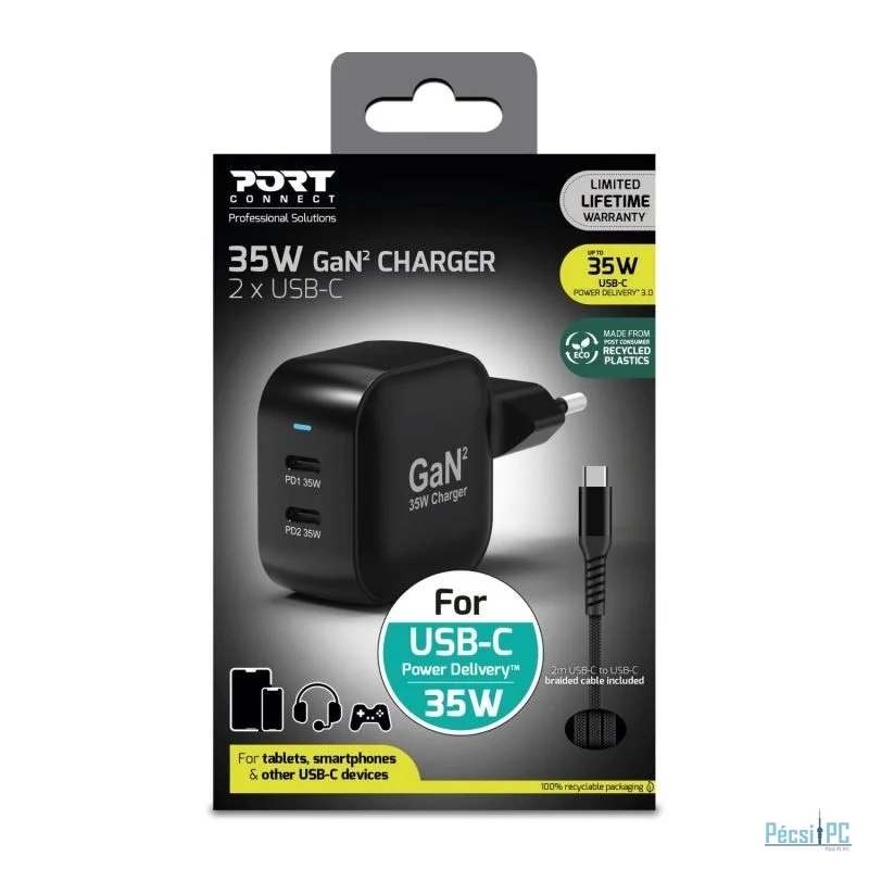 Port Designs GaN2 PD 35W Wall Charger with 2M USB-C cable Black