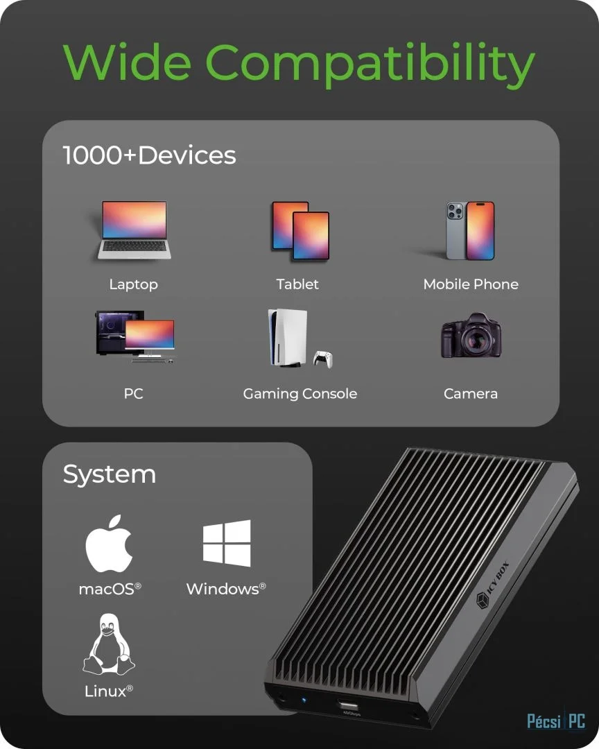 Hordozható, M.2, M.2, Type-C, USB4.0, NVMe, Műanyag, Passzív, Black